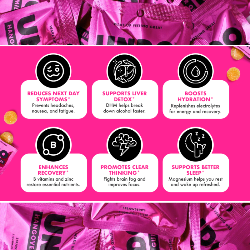 Take 2 gummies before or while drinking (and share a few with friends) to keep the night fun and the morning easy.*