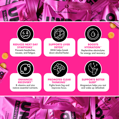 Includes 15 tropical-flavored, vegan, non-GMO, and gluten-free pouches, each with 2 gummies powered by DHM, Milk Thistle, and Electrolytes to help your body process alcohol, support liver detox, and reduce next-day fatigue.