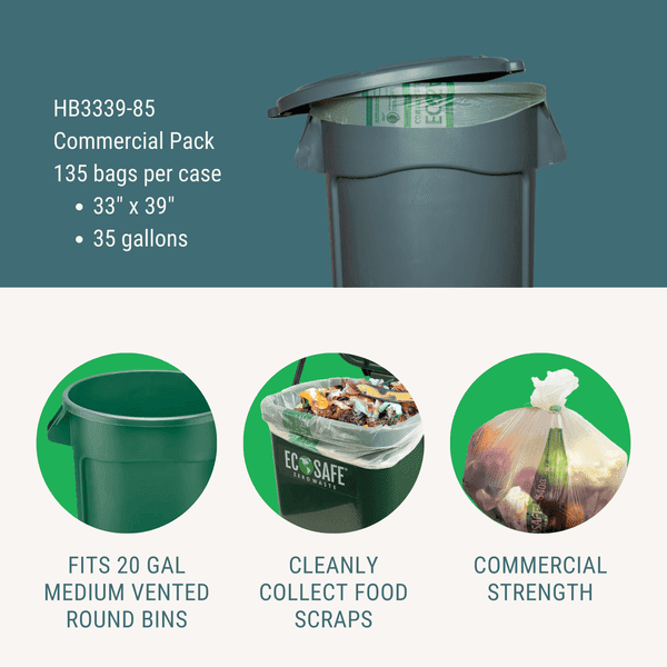 The EcoSafe® 33×39″ compostable bags are a versatile solution, commonly used for 28-gallon short round bins by U-line. They are also ideal for the 23-gallon Vented Slim Jim bin, especially for those who prefer a snug fit without the excess bag overlapping. These bags provide a clean, tailored look while offering durable, eco-friendly waste management for smaller bins. Perfect for commercial or residential settings, they ensure an efficient, neat disposal process while minimizing environmental impact.