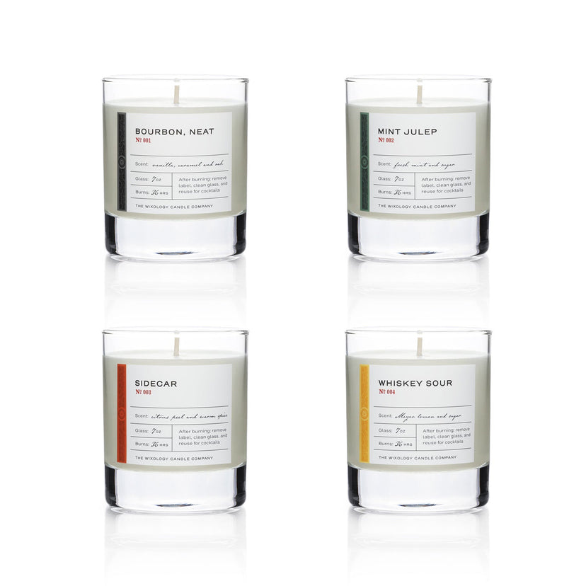 Includes Bourbon Neat (7 oz.), Mint Julep (7 oz.), Sidecar (7 oz.), and Whiskey Sour (7 oz.) Candles are packaged individually.