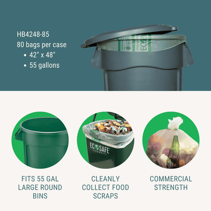 The EcoSafe® 42×48″ compostable bag is the top choice for schools, commonly used in 55-gallon round Brute bins. Their durable, eco-friendly design makes them perfect for handling high volumes of waste in educational settings. Additionally, these bags fit Max-R 50-gallon inserts for outdoor waste stations, providing a reliable and sustainable solution for managing trash both indoors and outdoors. With their versatility and strength, these compostable bags are ideal for busy environments that require efficient waste disposal.