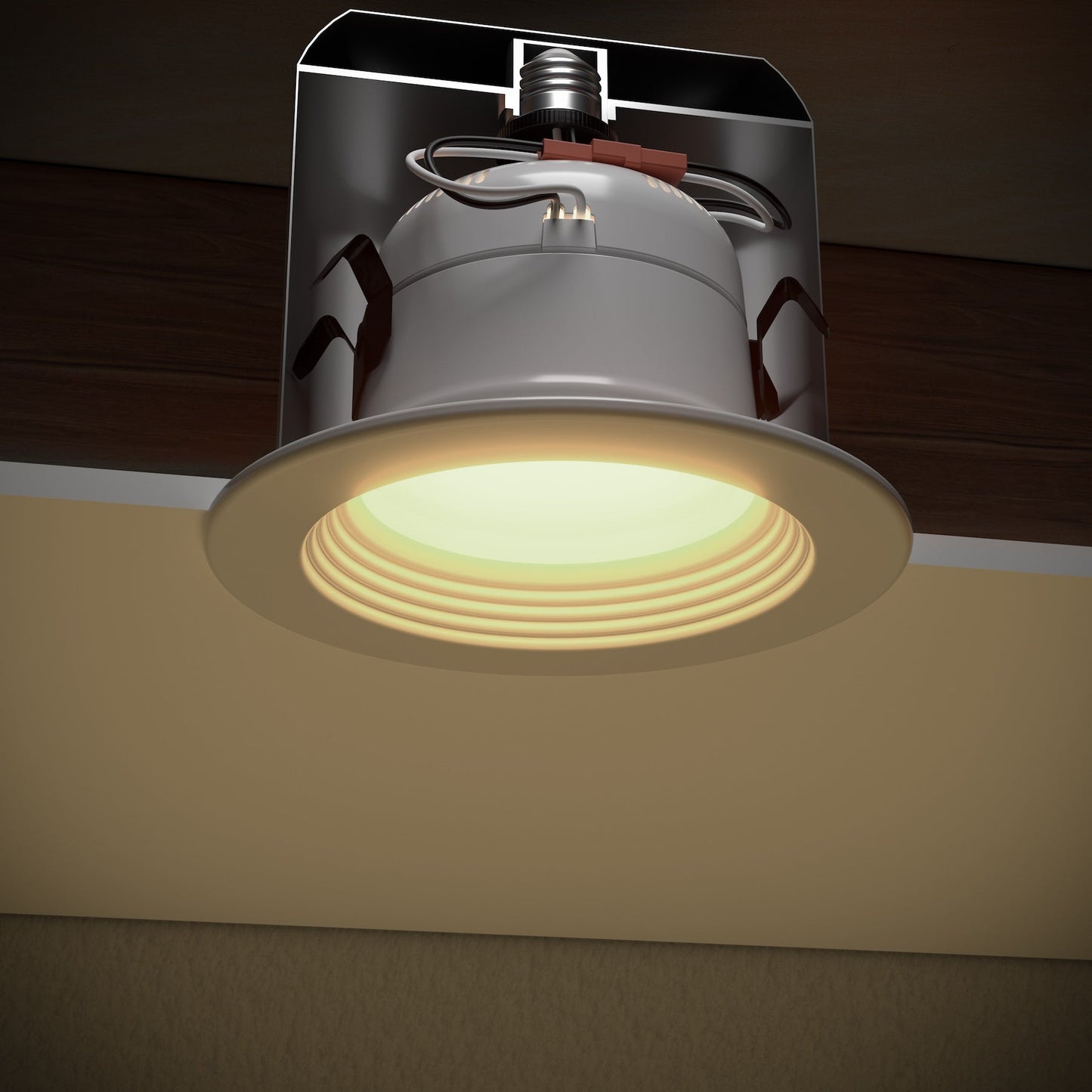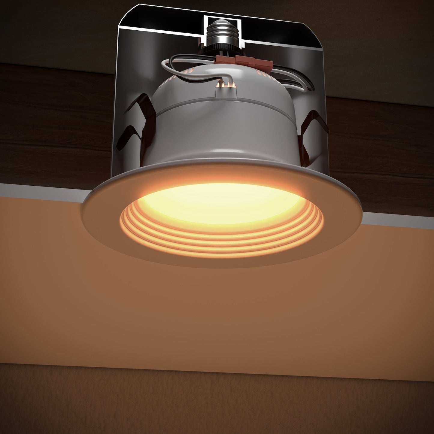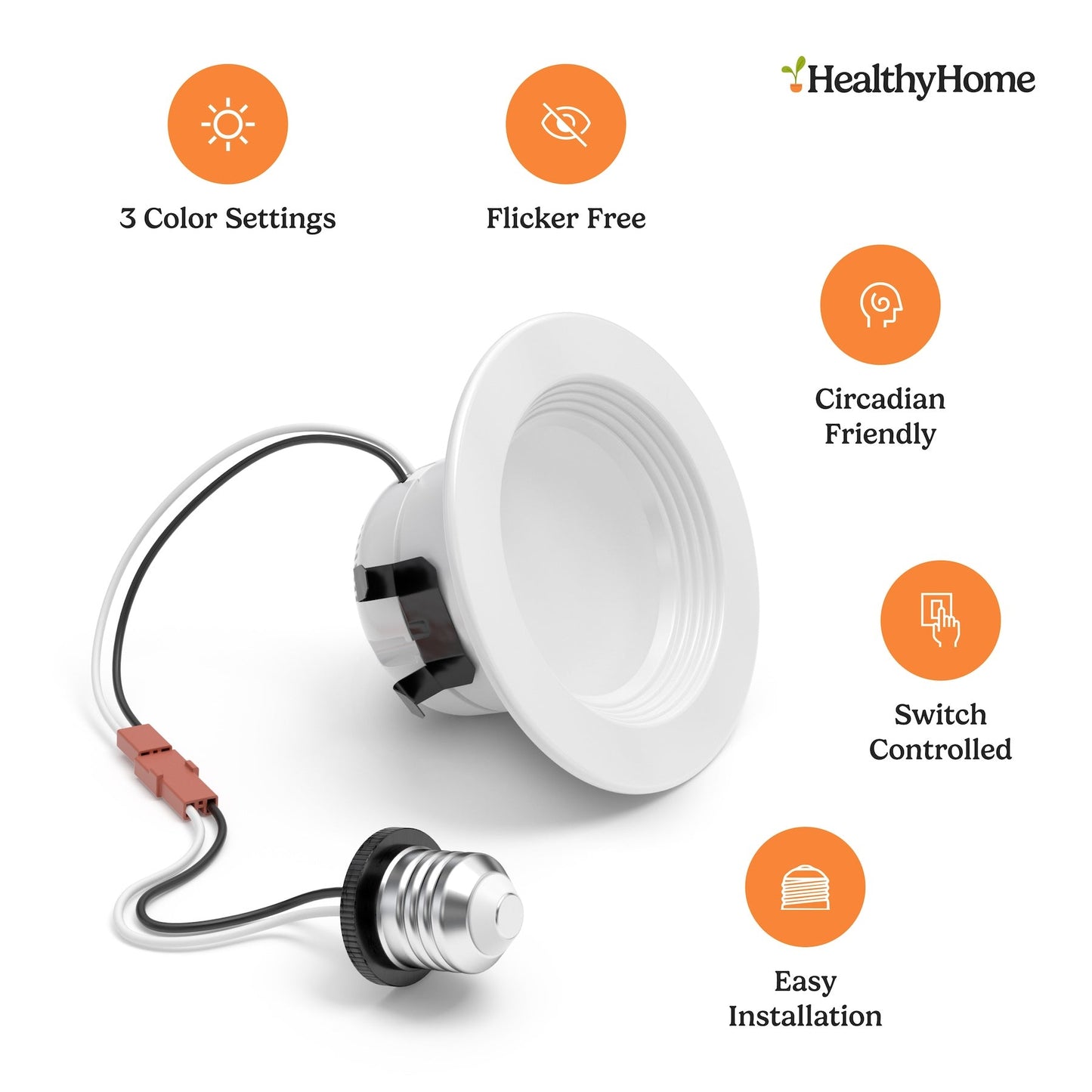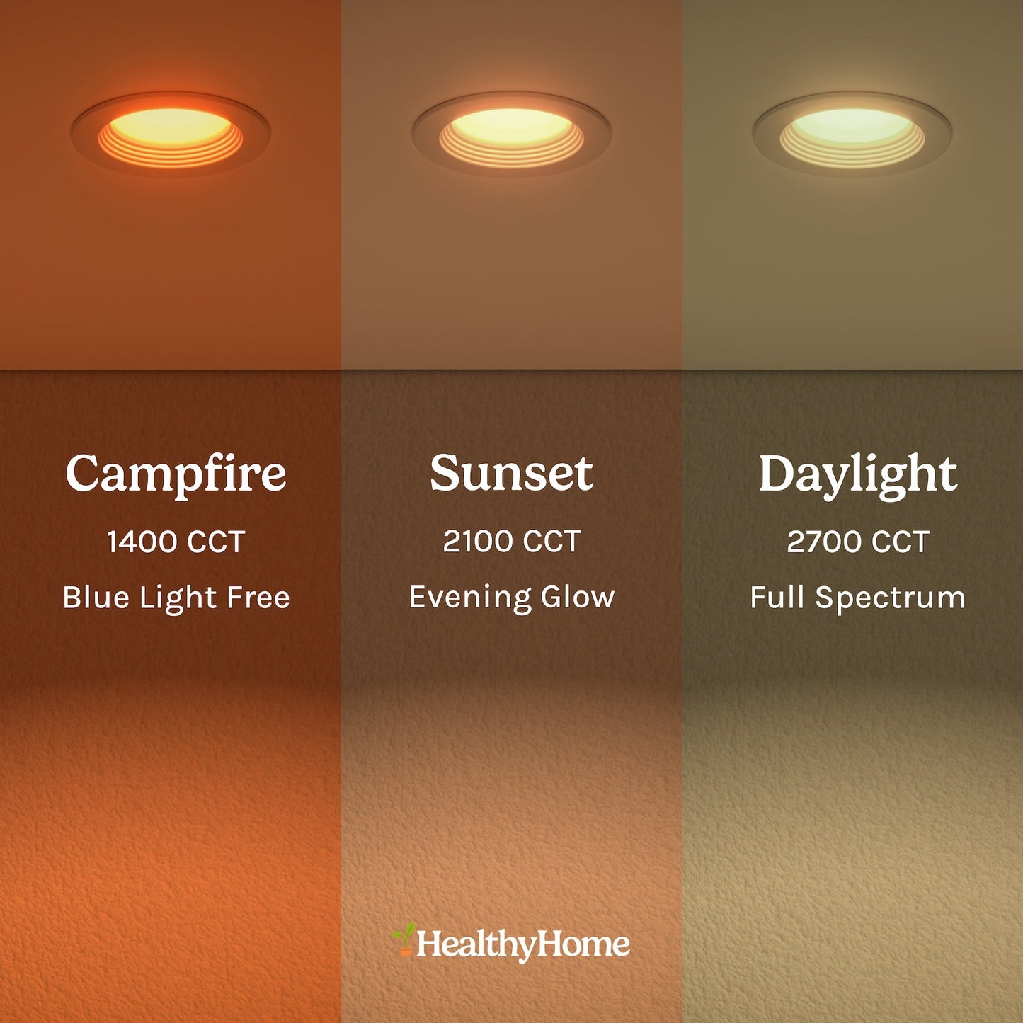 Retrofit recessed ceiling light with 3 color temperature settings to simulate natural daylight, sunset, and campfire lighting throughout your home.
