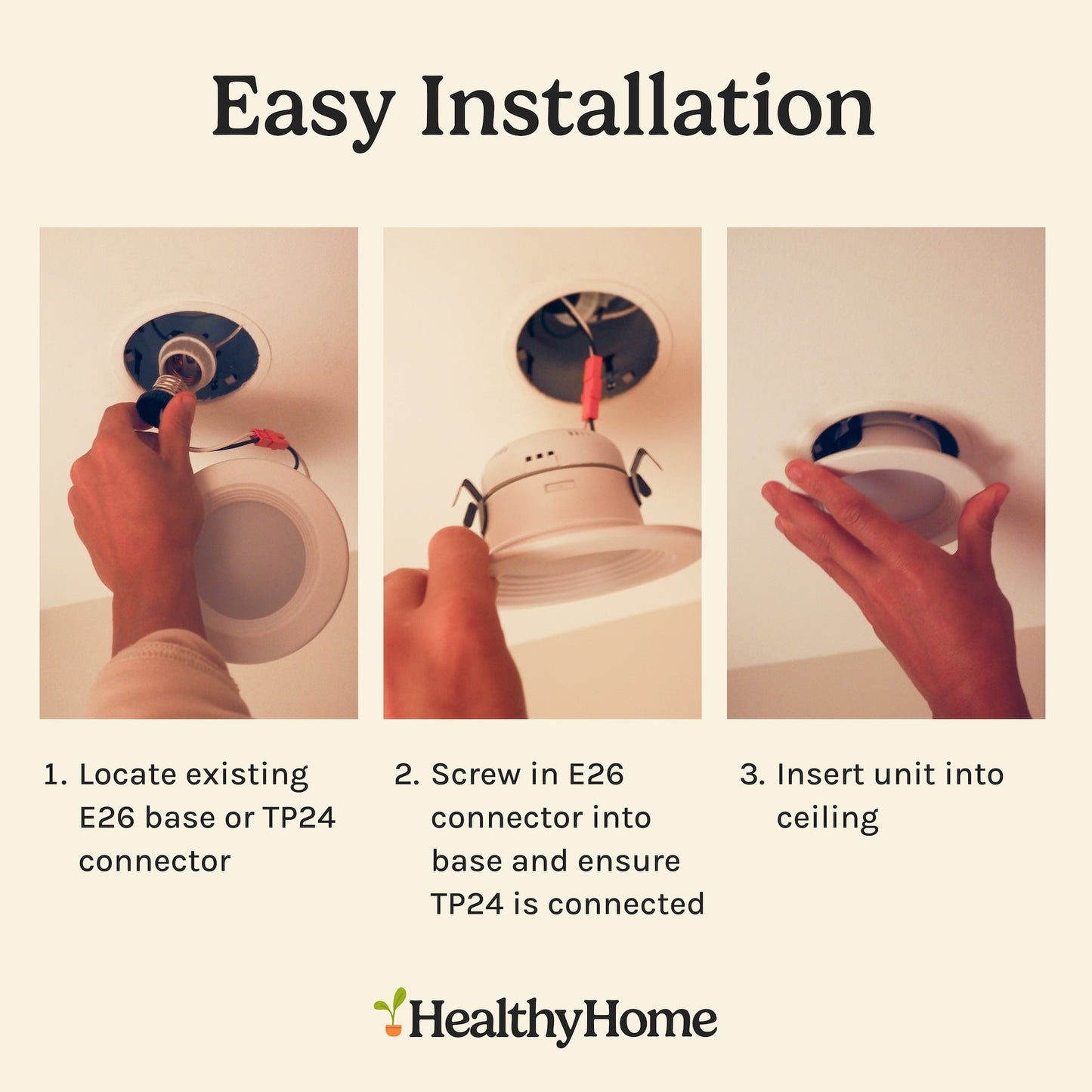 This light contains a standard E26 screw in base, as well as a TP24 connector which can be connected easily to existing recessed housing.