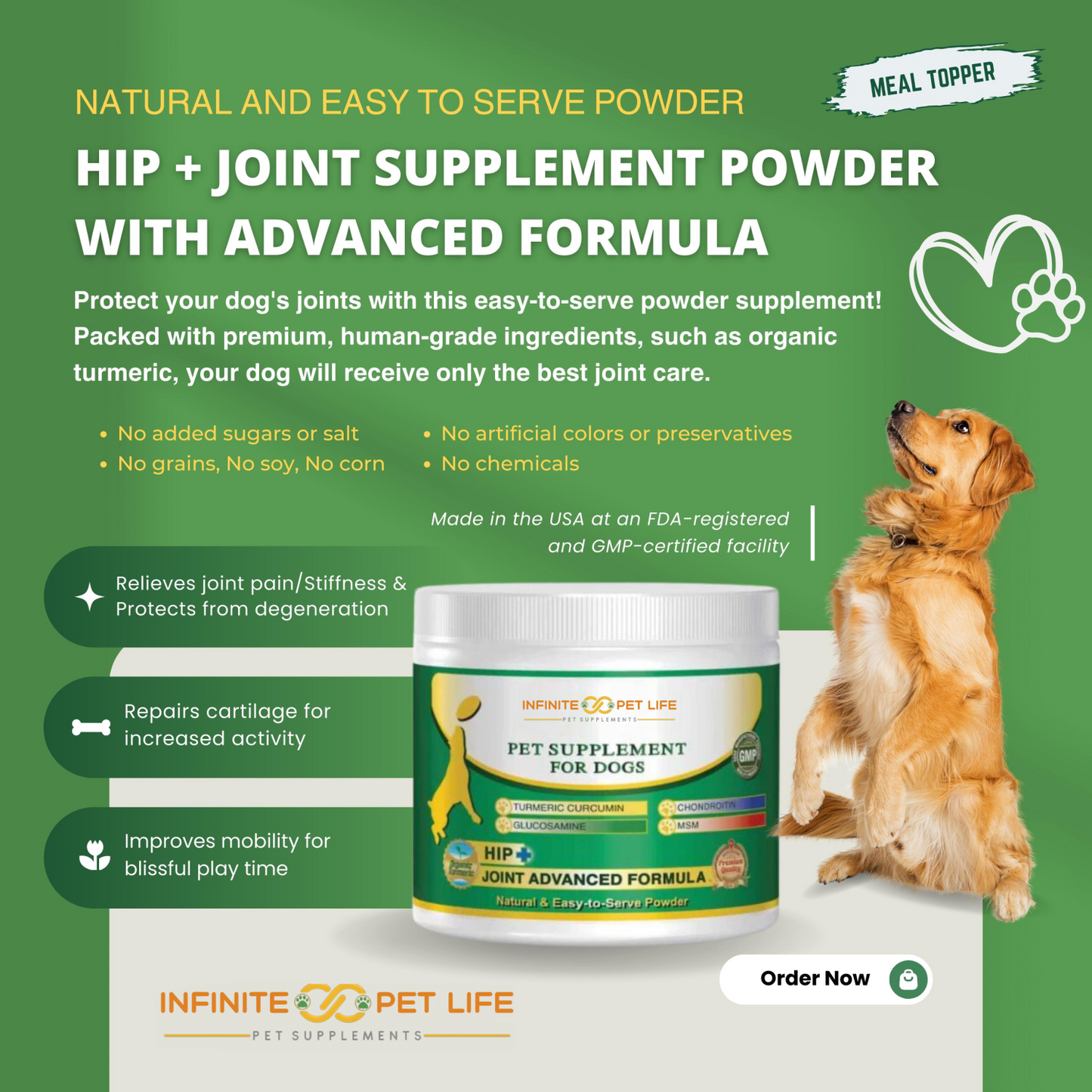 Renew Joint Health: Our dog supplements and vitamins Powder is prepared with Turmeric, Curcumin, Glucosamine, Chondroitin, and MSM. Our dog joint supplement is user-friendly. Just sprinkle it on their food, and they'll enjoy the benefits without any trouble.