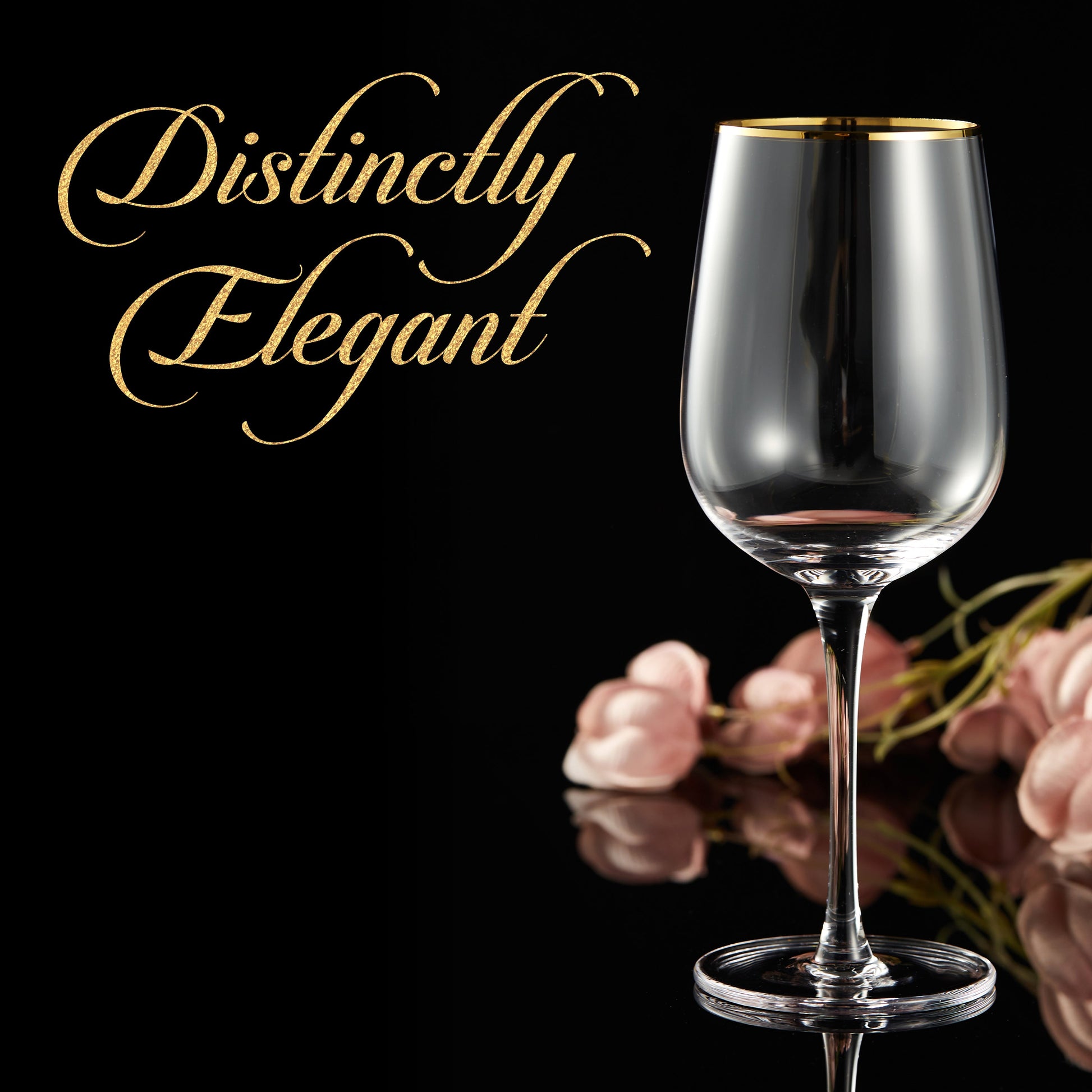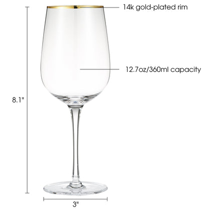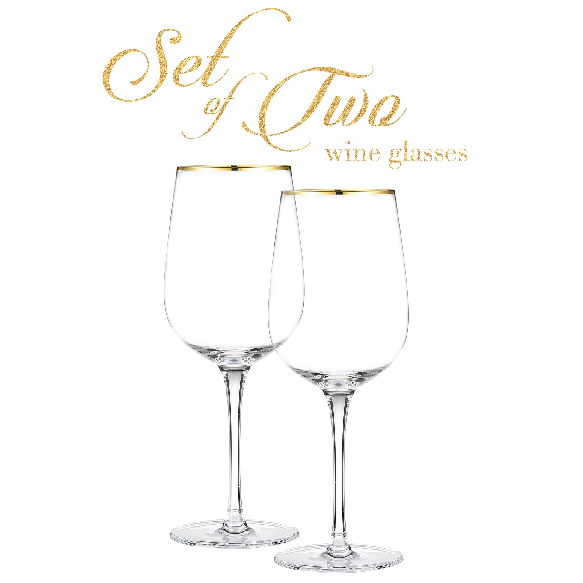 MODERN WINE GLASS SET: Toast your red, white, or any wine in large capacity long stem glasses STUNNING DECORATIVE ACCENT: Beautifully finished with sparkling gold rim surrounding the glass CELEBRATE & SAVOR: Make a statement at any occasion with the unique gold-rimmed wine glasses PERFECT GIFT: Thoughtful gift for weddings, house warming parties, birthdays, holidays QUALITY & STYLE: Lead-free crystal glass, 12.7oz capacity, 8.1in tall, 3in diameter