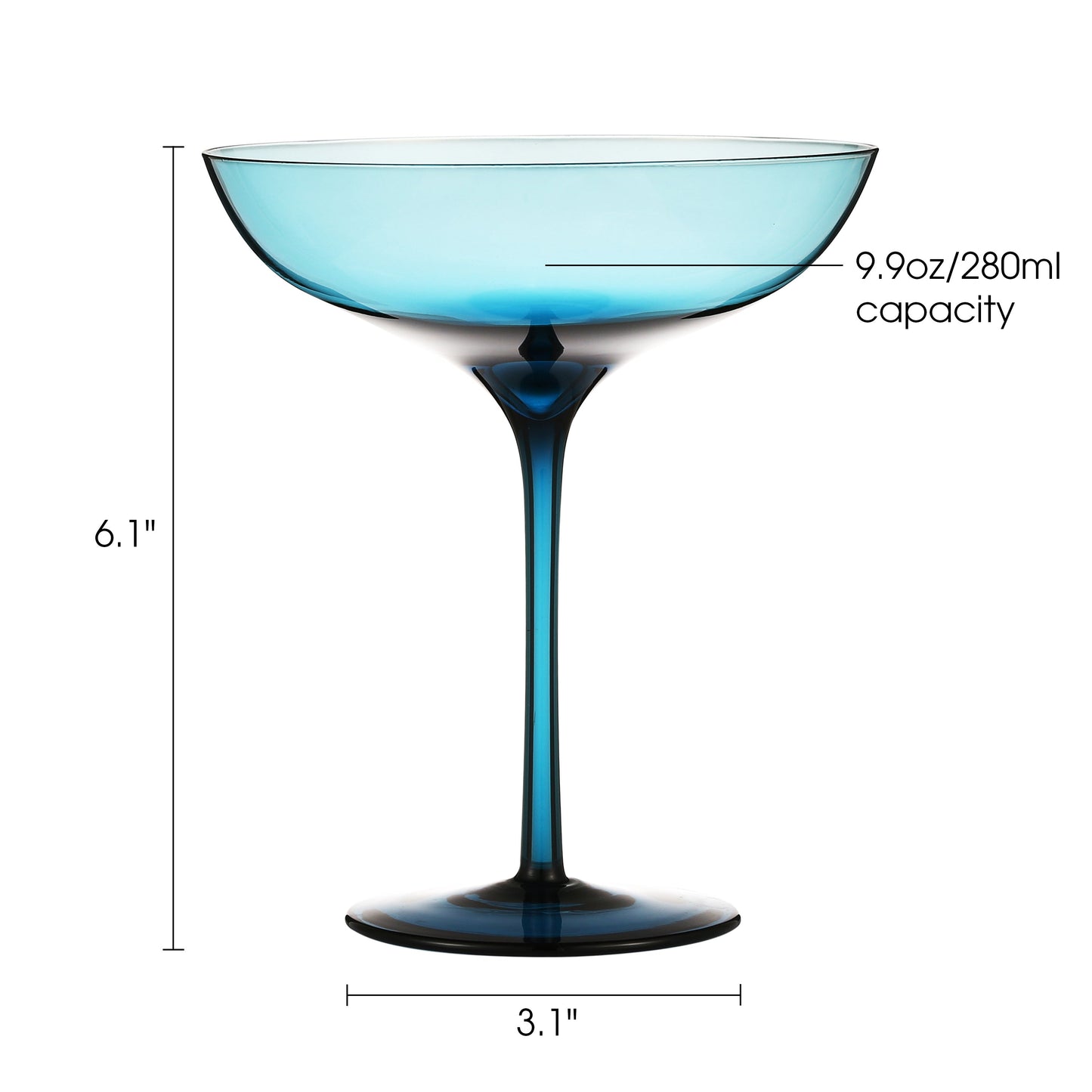 MODERN COCKTAIL GLASS SET: Toast your cocktail, martini or mixed drink in large capacity coupe glasses STRIKING COLOR: Beautiful colored glass adds a dramatic effect CELEBRATE & SAVOR: Make a statement at any occasion with the Smoke color tinted coupe glasses PERFECT GIFT: Thoughtful gift for weddings, house warming parties, birthdays, holidays & more QUALITY & STYLE: Soda lime glass, 9.9oz capacity, 6.1in tall, 5.1in diameter