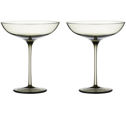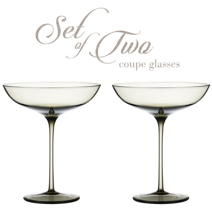 MODERN COCKTAIL GLASS SET: Toast your cocktail, martini or mixed drink in large capacity coupe glasses STRIKING COLOR: Beautiful colored glass adds a dramatic effect CELEBRATE & SAVOR: Make a statement at any occasion with the Smoke color tinted coupe glasses PERFECT GIFT: Thoughtful gift for weddings, house warming parties, birthdays, holidays & more QUALITY & STYLE: Soda lime glass, 9.9oz capacity, 6.1in tall, 5.1in diameter