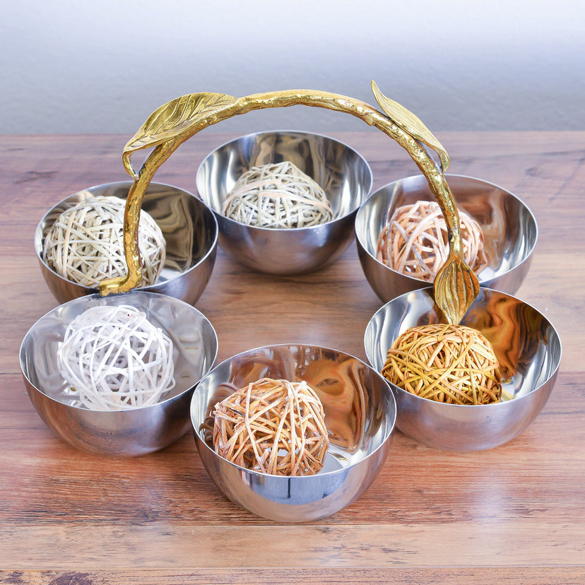 This stunning set of six metal bowls is designed to be both gorgeous and functional. The six bowls are brought together beneath a textured golden handle, and the finished look is striking and sure to attract admiring remarks.
