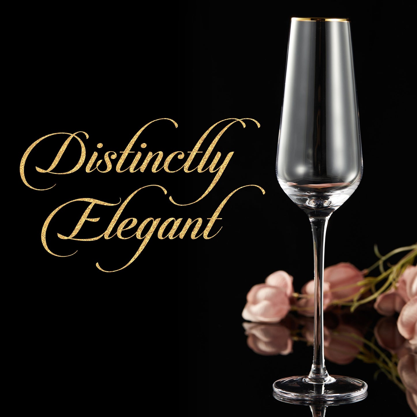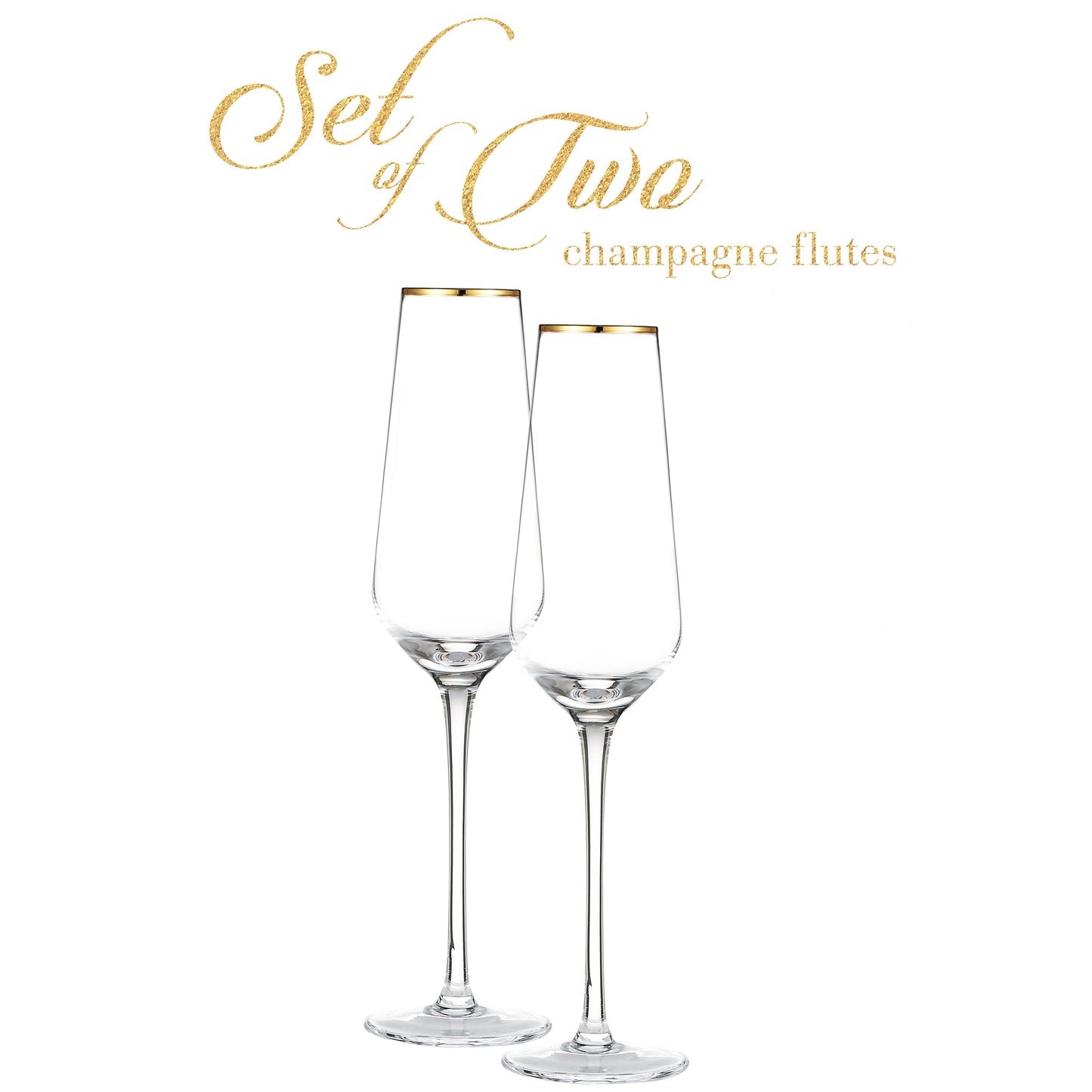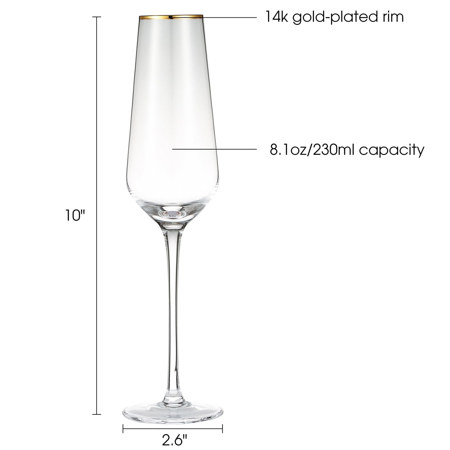 TALL CHAMPAGNE GLASS: Make a toast with an elegant flute for your bubbly, sparkling wine or cocktail STUNNING DECORATIVE ACCENT: Beautifully finished with a shiny gold rim CELEBRATE & TOAST: Make a statement at any occasion with the unique gold-rimmed champagne flutes QUALITY & STYLE: Lead-free crystal glass, 8.1oz capacity, 10in tall PERFECT GIFT: Thoughtful gift for weddings, house warming parties, birthdays, holidays & more