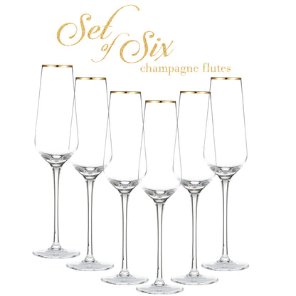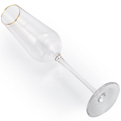 TALL CHAMPAGNE GLASS: Make a toast with an elegant flute for your bubbly, sparkling wine or cocktail STUNNING DECORATIVE ACCENT: Beautifully finished with a shiny gold rim CELEBRATE & TOAST: Make a statement at any occasion with the unique gold-rimmed champagne flutes QUALITY & STYLE: Lead-free crystal glass, 8.1oz capacity, 10in tall PERFECT GIFT: Thoughtful gift for weddings, house warming parties, birthdays, holidays & more