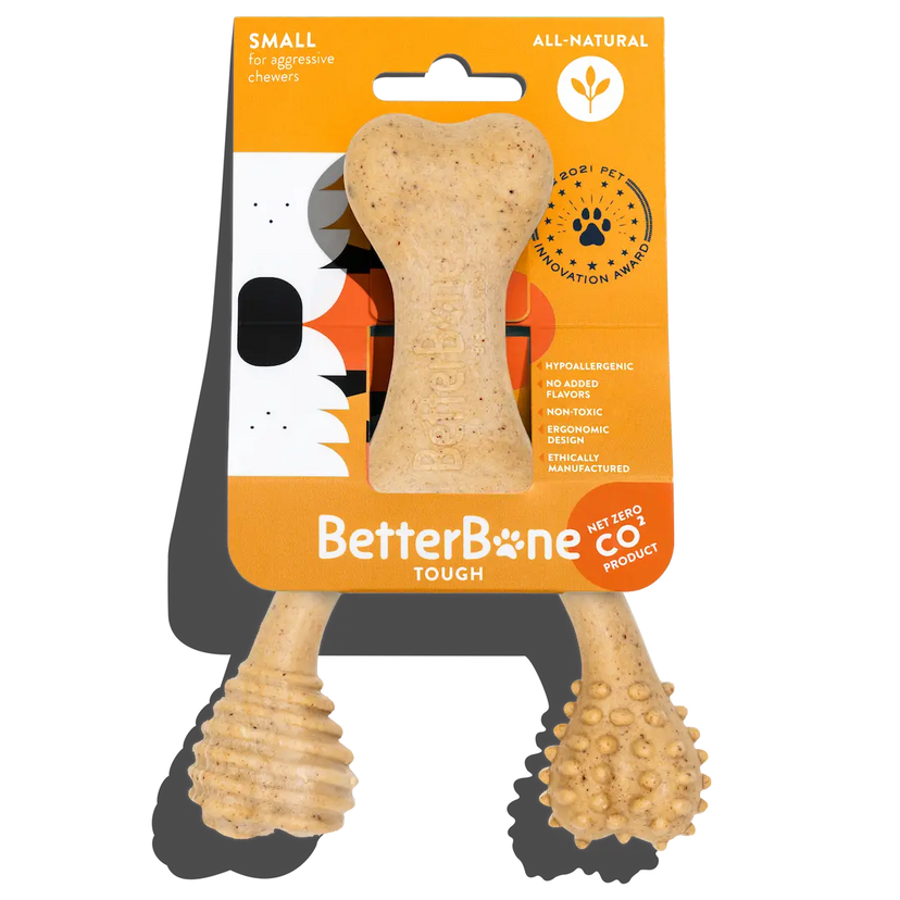 Crafted from all-natural, food-grade ingredients, it is designed to promote health and dental hygiene with its super durable natural, food-grade, GMO-free ingredients. Our unique teeth-cleaning ends reach tricky hard-to-clean areas. Pair this with our natural, non-toxic, hypoallergenic, and splinter-resistant composition; BetterBone TOUGH is the perfect chew toy for the strong and aggressive chewer in your life—the perfect replacement for nylon, or antlers.
