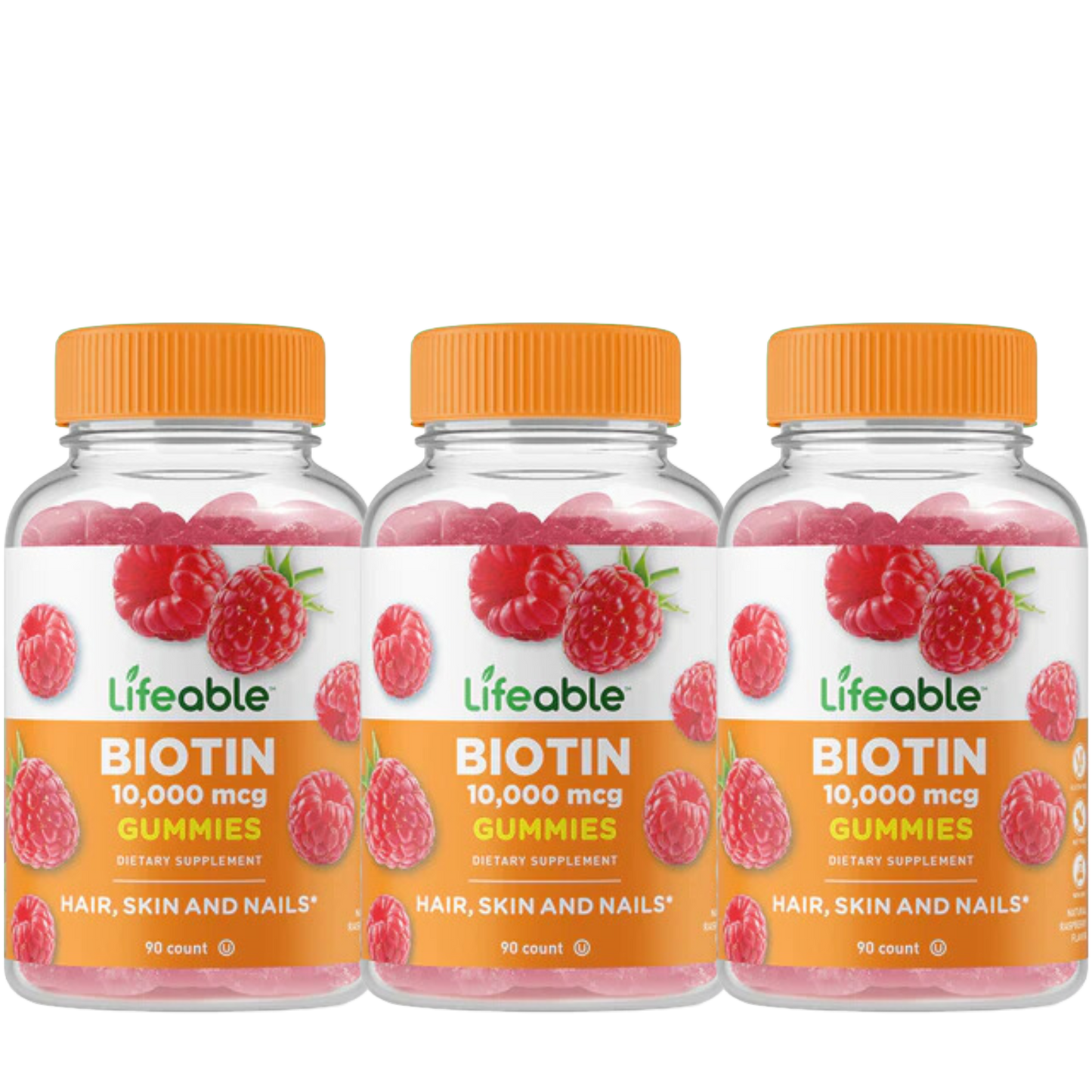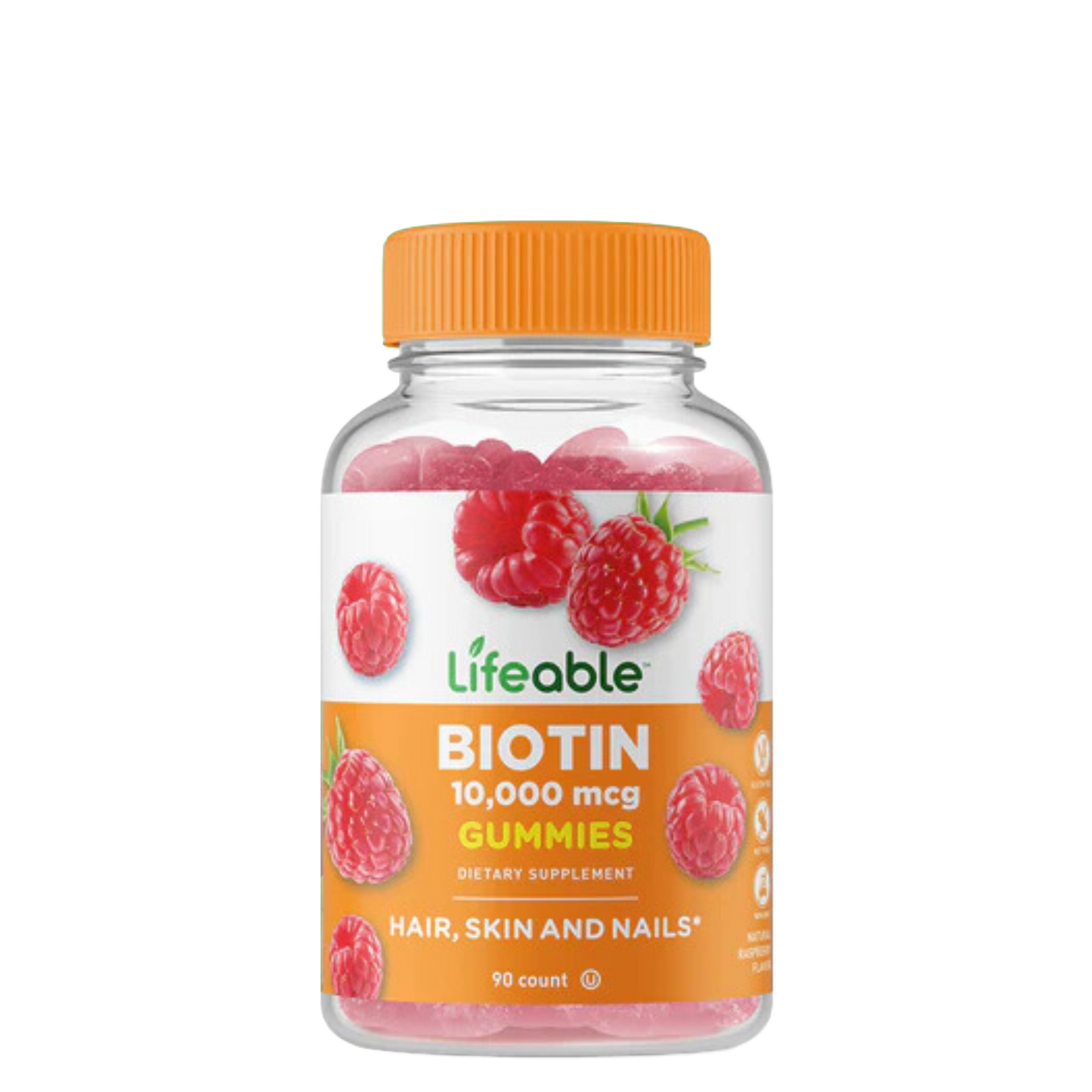 with a delicious raspberry flavor, each serving of these gummies provides 10,000 mcg of Biotin, a water soluble B vitamin, which studies show is important for supporting healthy hair, skin and nails.