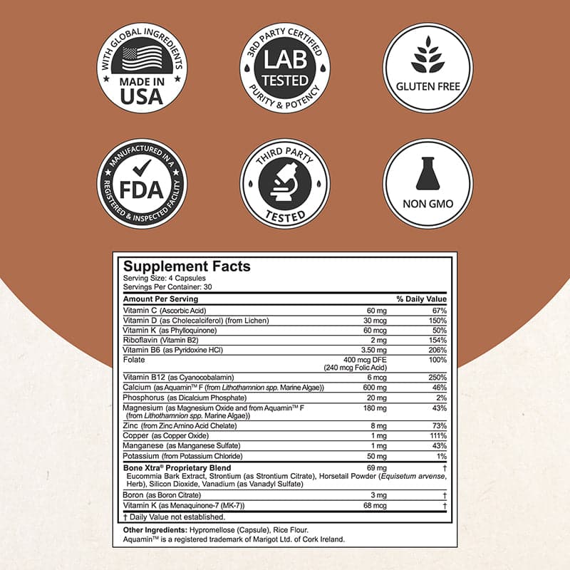 ⢠Vitamin K2, Vitamin B12, Manganese, Potassium, and Boron, plus special ingredients like Vanadium and Eucommia Bark, ensuring a holistic approach to bone wellness.*