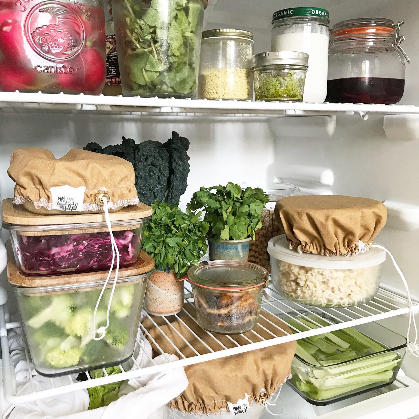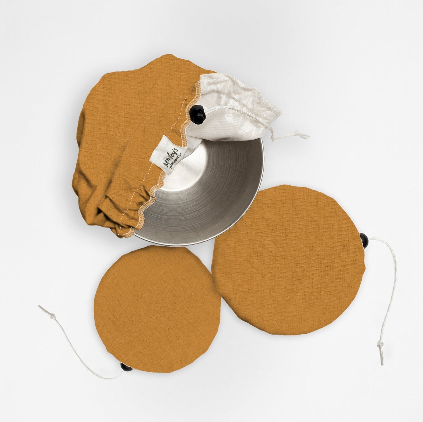 Our Bowl Covers are unique because the design utilizes a cord stop and drawstring. Unlike elastic, this provides ultra flexible sizing and a customizable fit for each container size. We like to use them to cover foods that need to retain moisture like salads, fruit and pastas.