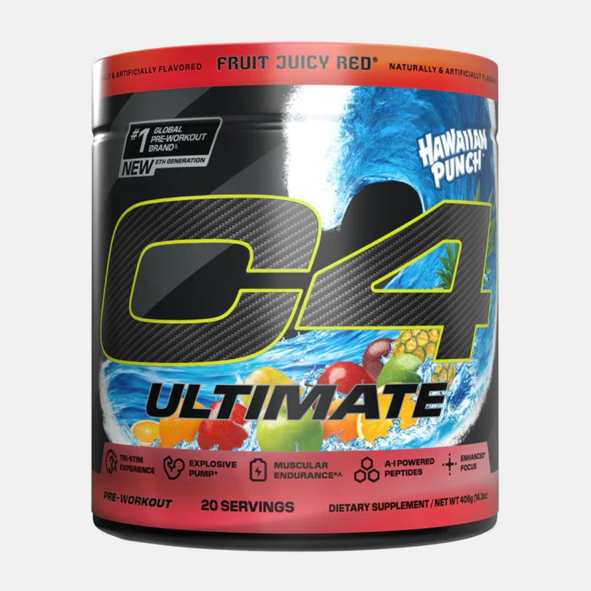 C4 Ultimate x Hawaiian Punch Highlights: HIT your hardcore workouts HARDER with the revamped C4 Ultimate – made for warriors who demand nothing but the best. This cutting-edge formula packs a potent punch of 300mg of caffeine, TeaCrine®, and Dynamine®, unleashing high-stim energy experience that propels you through the most grueling training sessions with unparalleled power.