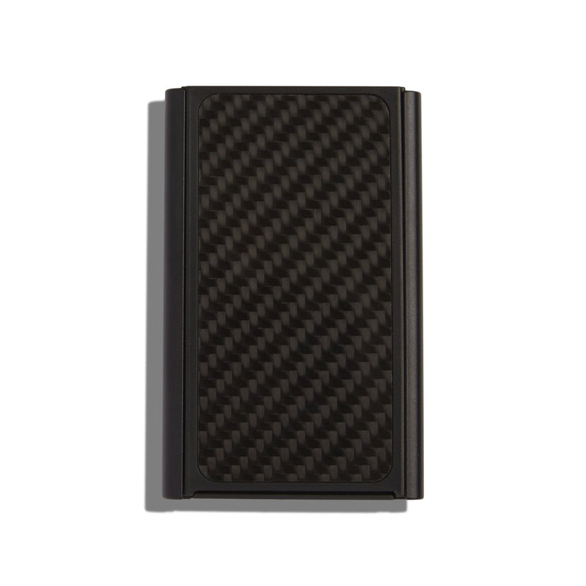 Carbon fiber, RFID blocking wallet that holds up to 6 cards. Easily slide the wallet to eject cards. Super slim design with a money clip on the back. Perfectly fits in your front pocket for a minimal, everyday carry.
