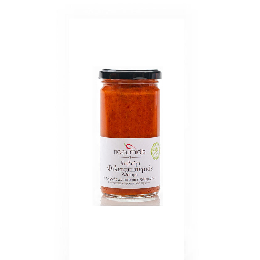 100% Red authentic Florina roasted pepper spread. Grounded, with extra virgin oil olive, salt, and lemon. Peeled by hand in order to keep the original flavors. A jar of 260gr contains 3 kg of fresh peppers and is cooked for 3 hours for peppers’ concentration. Handmade organic product pasteurized without preservatives. Served hot or cold as an appetizer, as a dipping sauce, as spread in pastries or toasts. Accompanied by sauces or food.