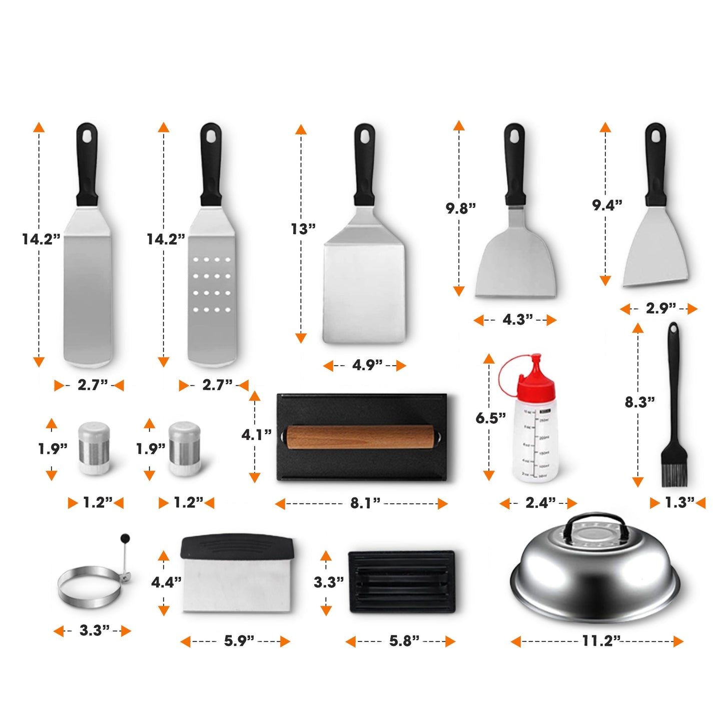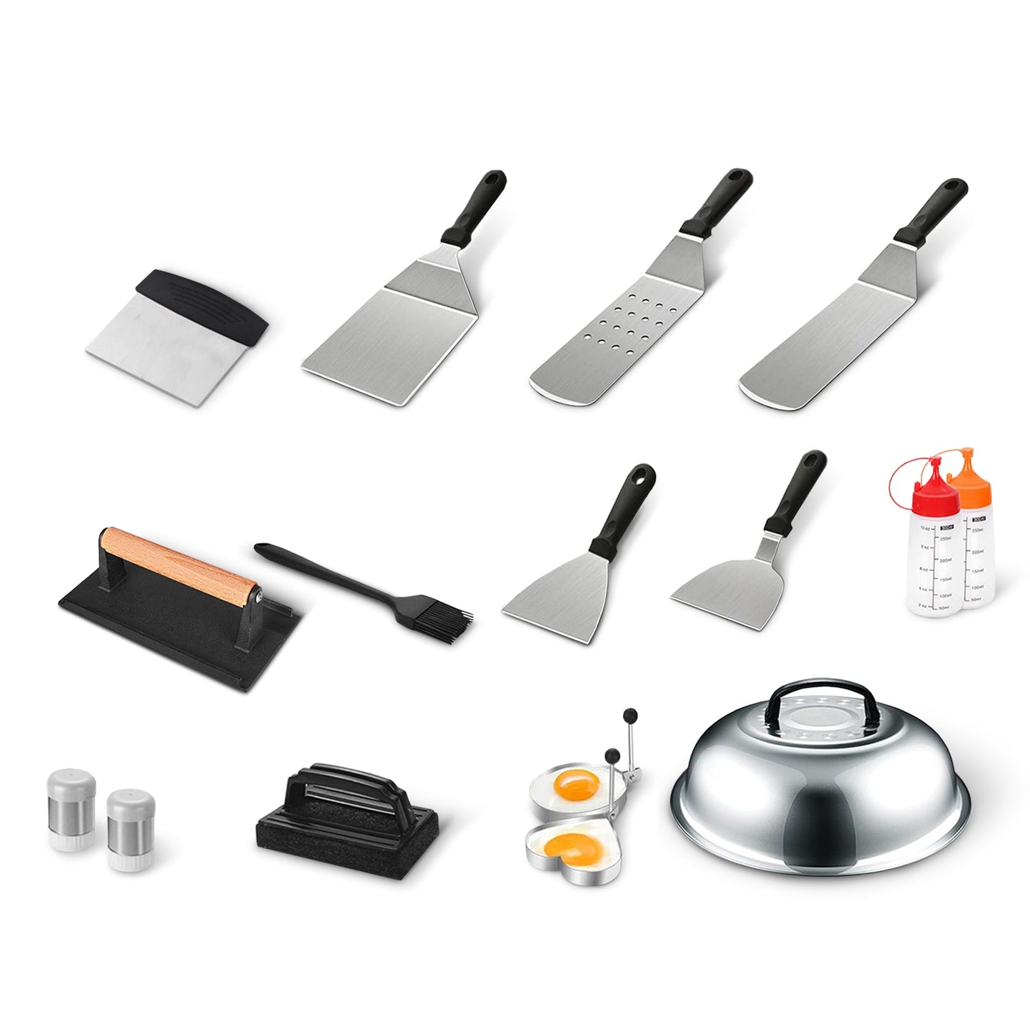 COMPLETE 18-PIECE GRIDDLE SET: Includes everything you need: spatulas, scraper, egg rings, bottles, and more. Perfect for griddle cooking, BBQs, and outdoor adventures