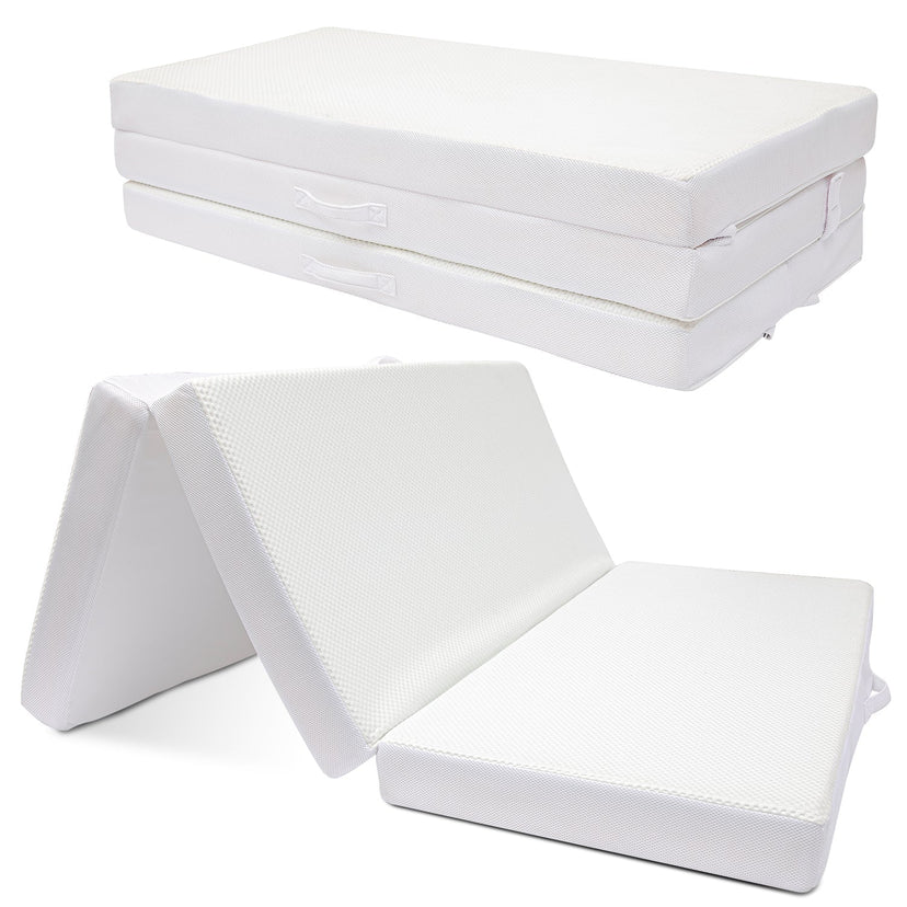 CONVENIENT - Trifold lightweight design and practical carry handles make this folding mattress the perfect solution for small spaces; removable bamboo cover is machine washable for easy care