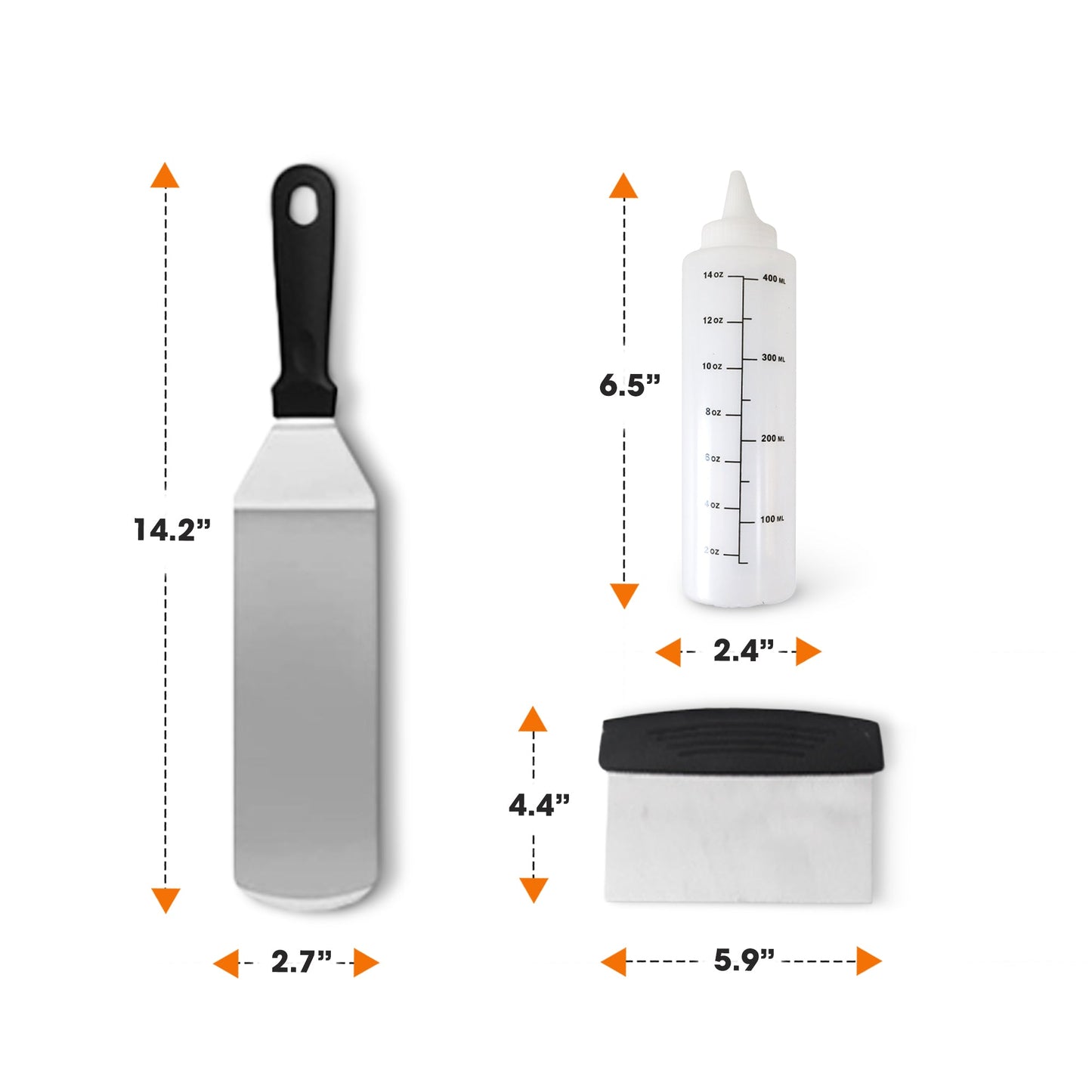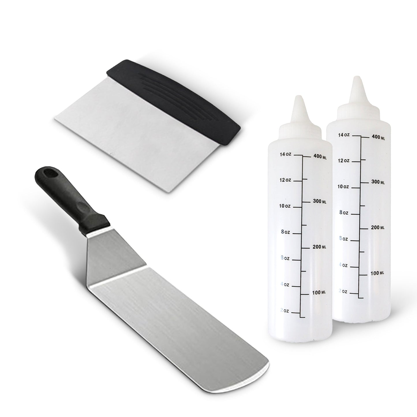 VERSATILE TOOLS FOR EVERY TASK: Includes two spatulas, two squeeze bottles, and one scraper—perfect for flipping, mixing, cutting, and cleaning. Tackle every cooking task with ease and precision