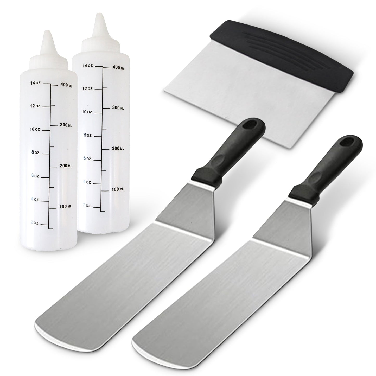 Cheer Collection 5-Piece Stainless Steel Griddle Set – Spatulas, Scraper, and Squeeze Bottles for BBQ, Grill, and Kitchen Cooking
