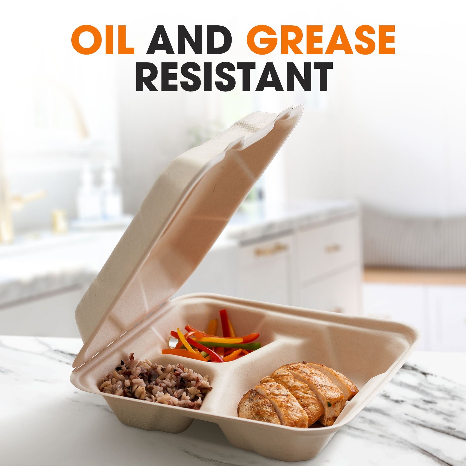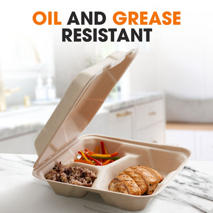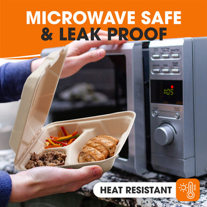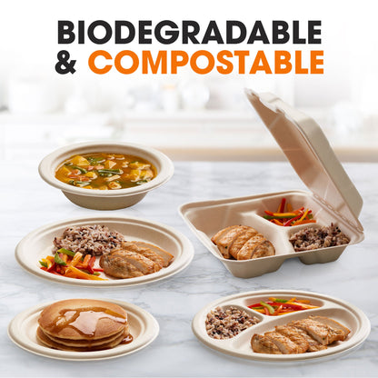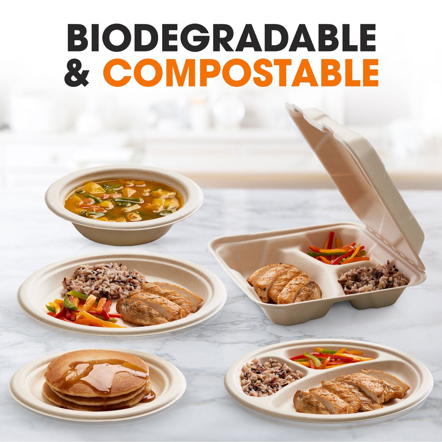 SUSTAINABLE AND RENEWABLE: Made from 100% sugarcane fiber, these compostable food containers are a tree-free and plastic-free alternative, making them eco-friendly and compostable, unlike plastic containers