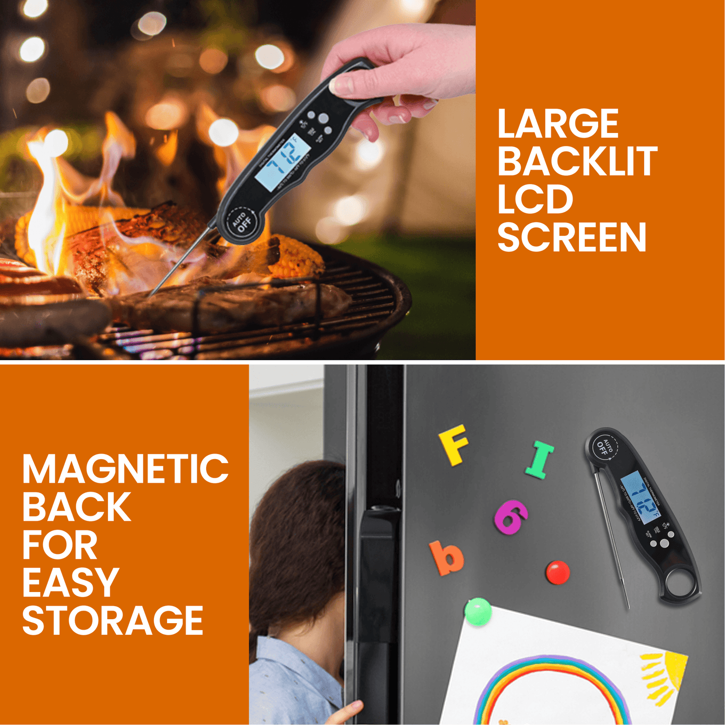 • Portable and Easy To Use: The digital thermometer for cooking allows you to switch between Fahrenheit and Celsius with the press of a button. It uses a foldable design so you can easily carry or store it while saving space making it perfect for camping and beach trips