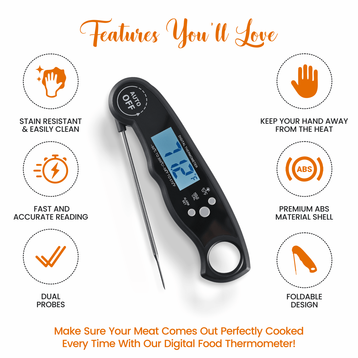 • Thoughtful Cooking Gift Idea: Our folding meat thermometer makes a thoughtful gift for friends and family on any occasion you have in mind to impress. The steak thermometers are the perfect BBQ gift for Housewarmings, Birthdays, Christmas, New Year’s, etc.
