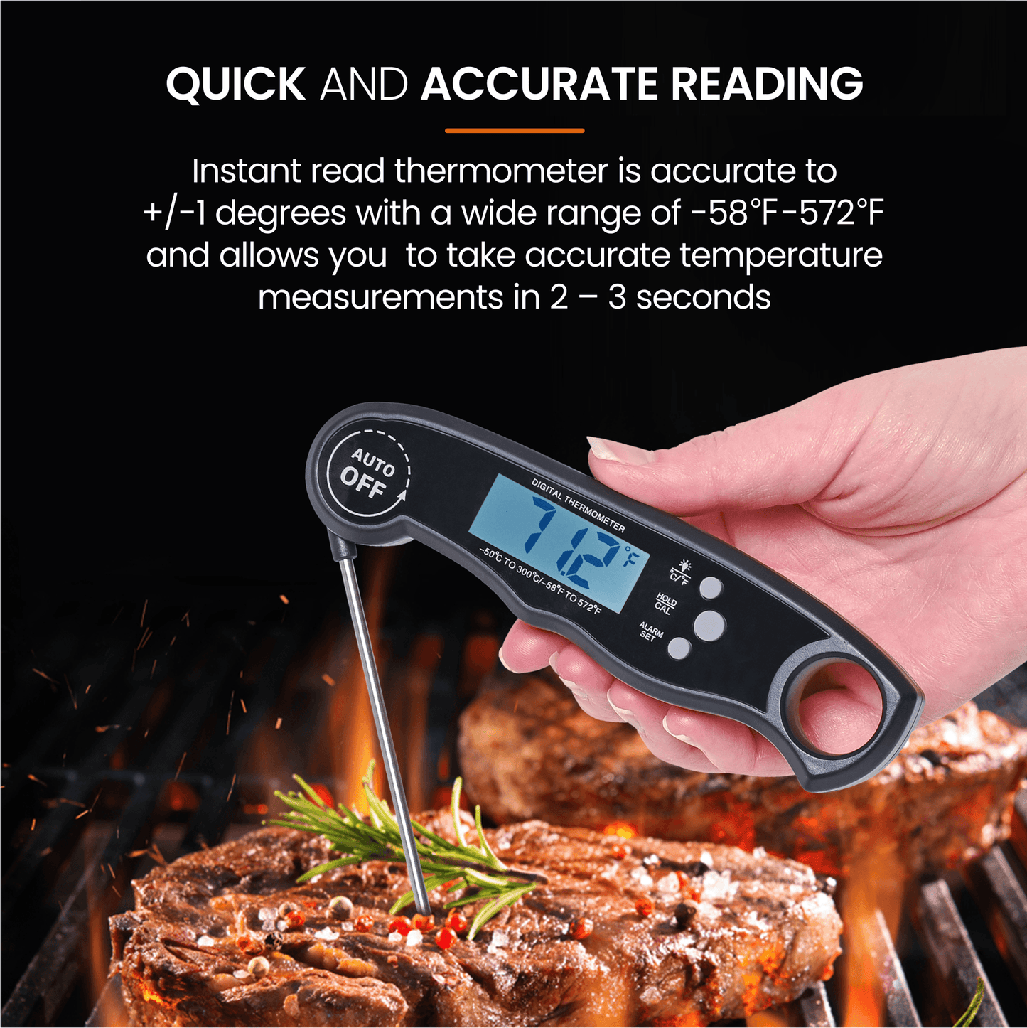 • Quick And Accurate Reading: This instant read thermometer is accurate to +/-1 degrees with a wide range of -58° F -572° F and allows you to take accurate temperature measurements in 2 – 3 seconds while the long probe keeps your hand safely away from the heat