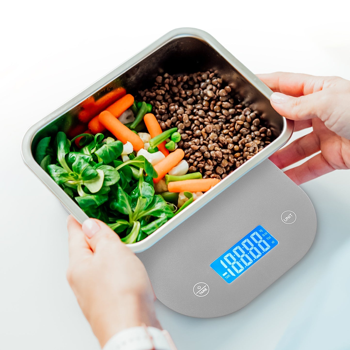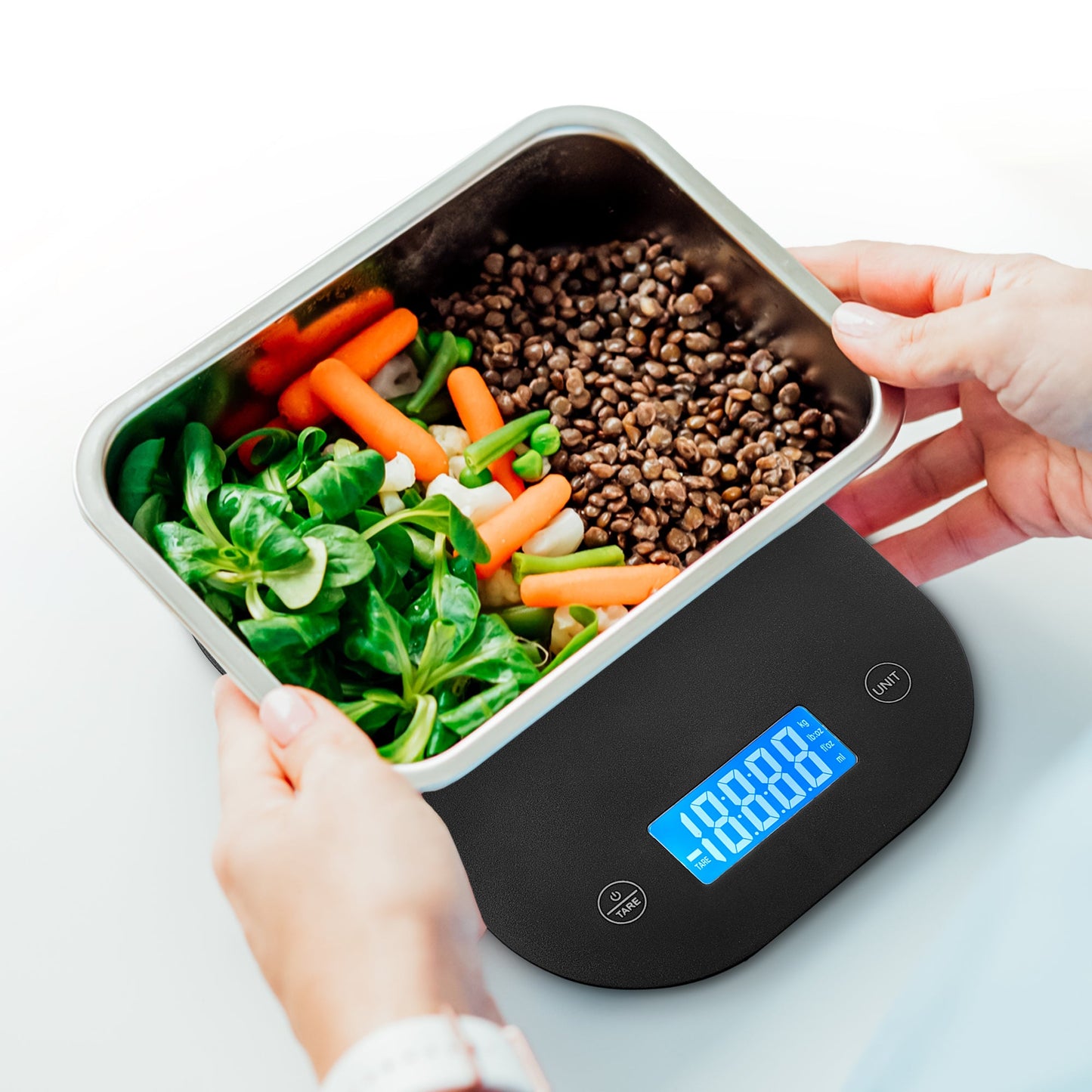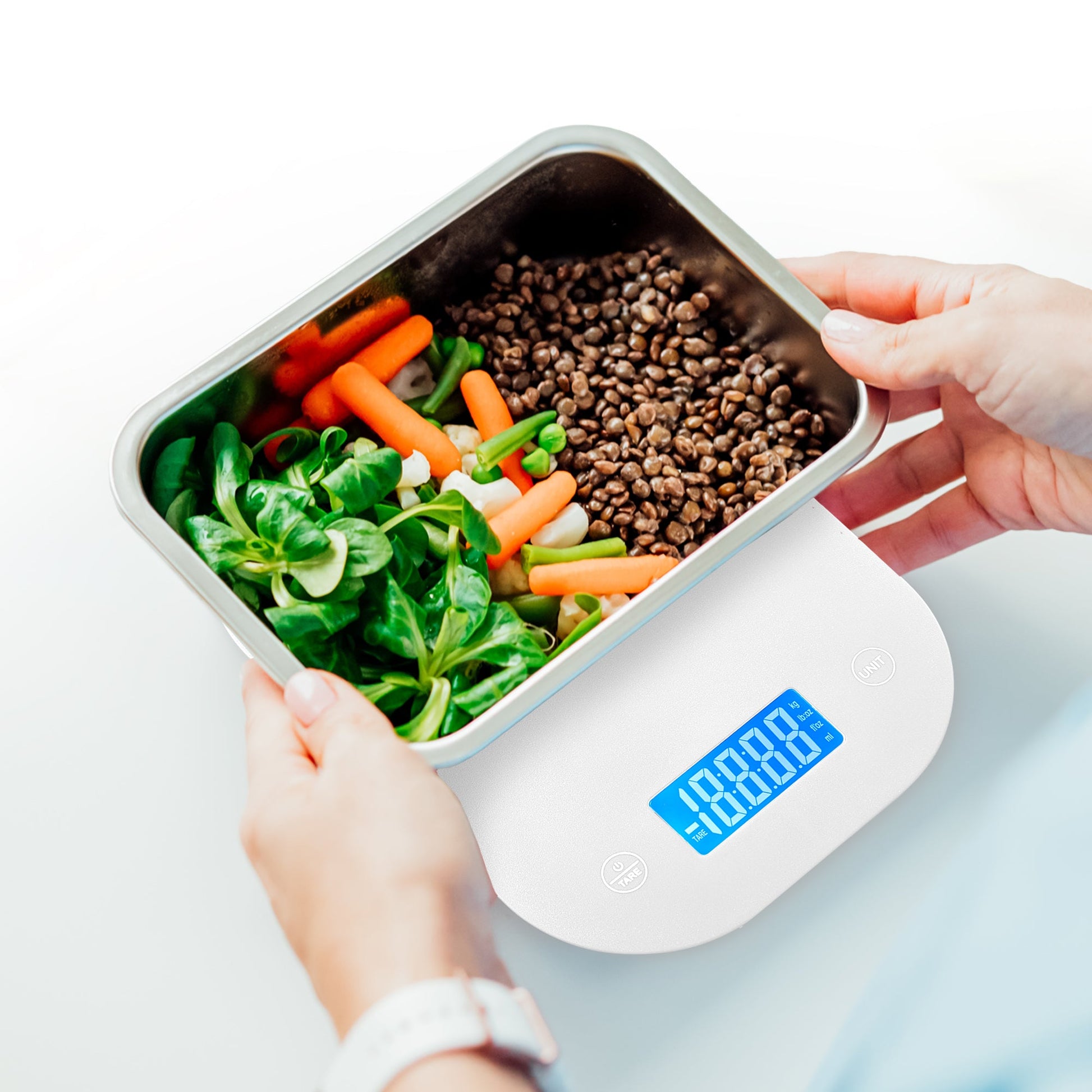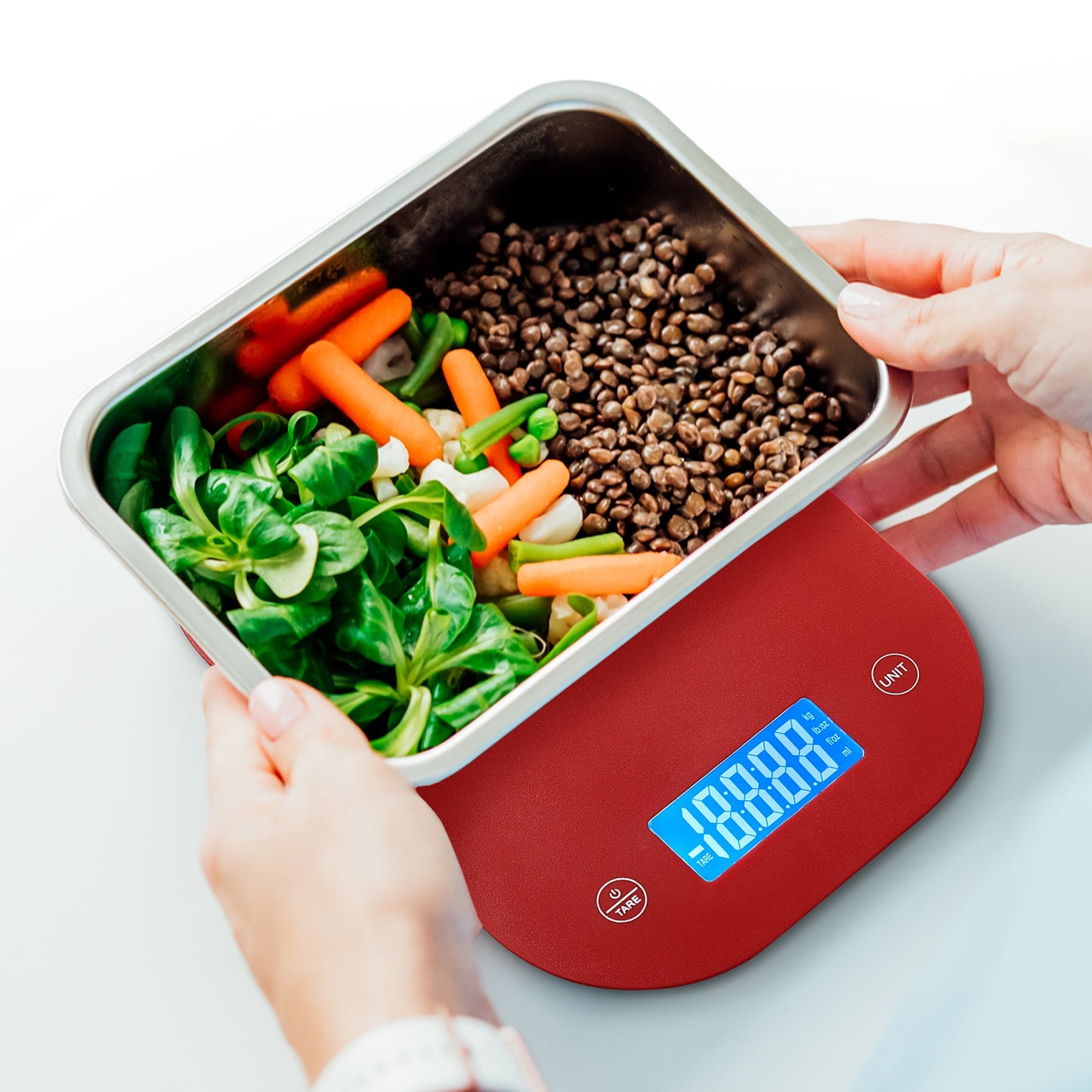 - Large display for easy reading, even with large containers