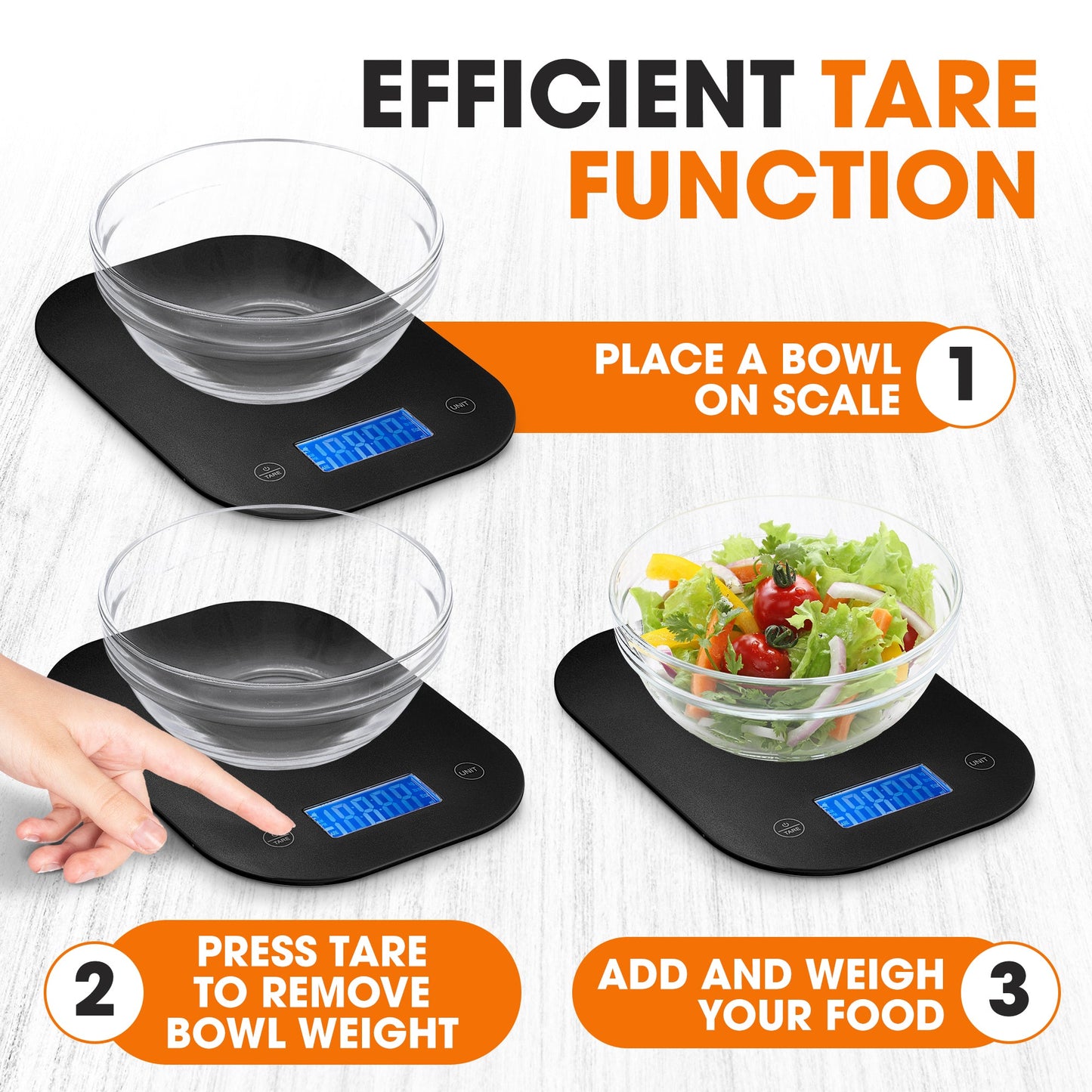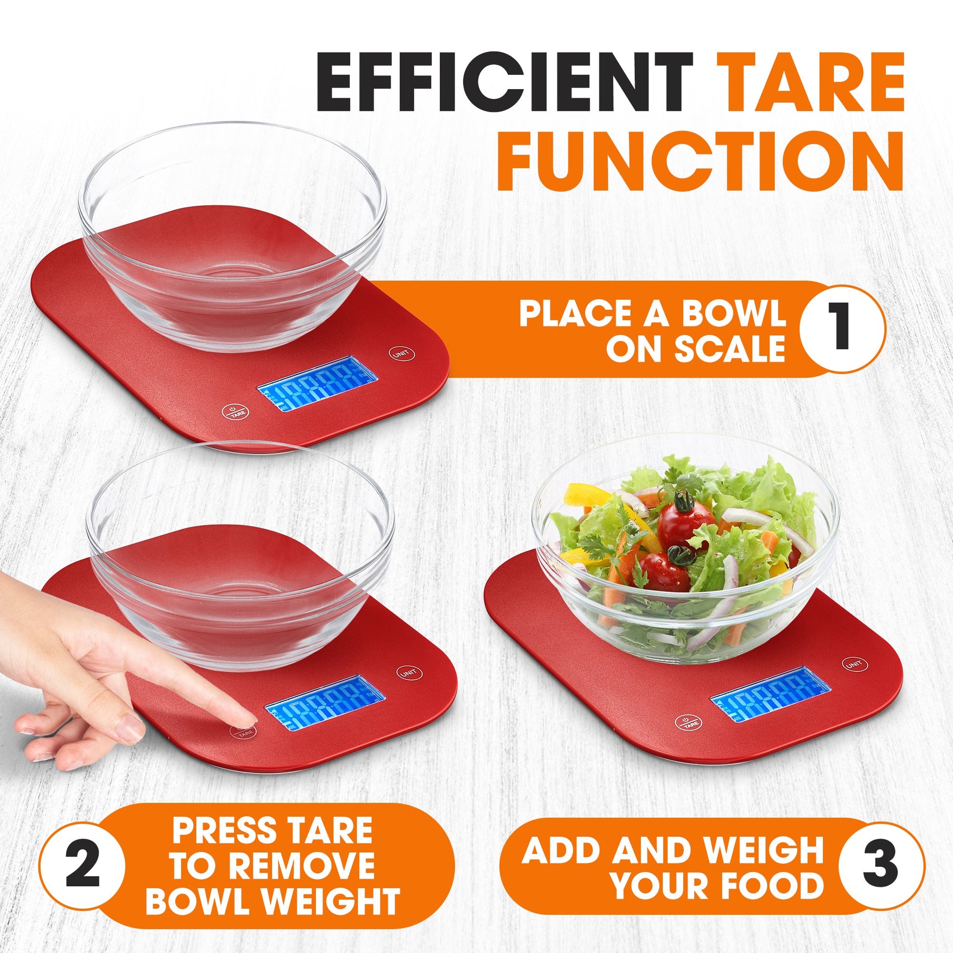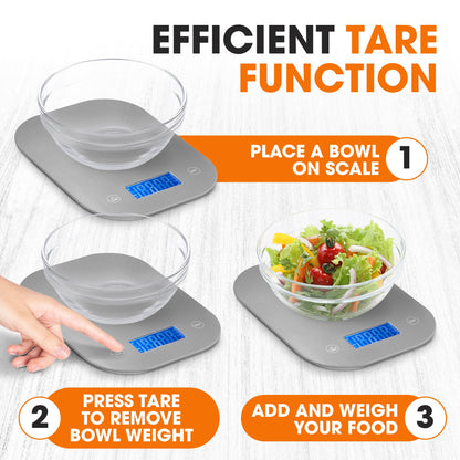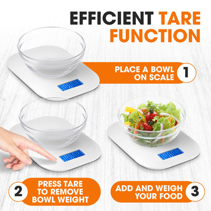 EFFICIENT TARE FUNCTION: Simplify your weighing process with the tare function; place a bowl, press tare to zero out the weight, and add your ingredients. No more manual calculations needed. Streamline your meal prep with this convenient feature. Requires 2 AAA batteries(NOT INCLUDED)