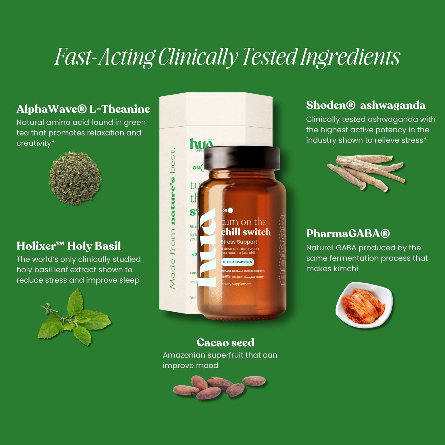Take a literal chill pill with our Chill Switch™ Stress Support supplement. De-stress with natural, clinically studied ingredients, including ashwagandha, l-theanine, GABA, holy basil, and cacao seeds. The extracts we use in our formula are patented for their high potency and bioavailability to bring you calm without any drowsiness.