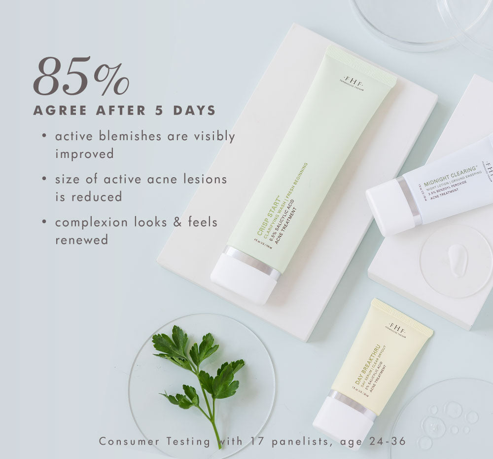 Clinical test performance: When used as part of our Comeback Clear⢠acne kit, 85% agreed active blemishes were visibly reduced & size of active lesions reduced in just 5 days. See more test results (inset left).