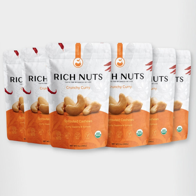 Sprouted cashews get a kick of curry powder, cayenne pepper, and turmeric. Delicious on their own or to top off a salad, crumble on salmon, or spice up your favorite meal.