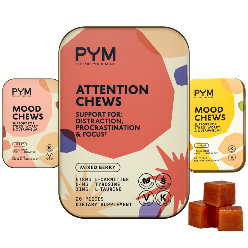 Attention Chews are formulated with L-Carnitine, Tyrosine & L-Taurine to get you into a flow state for hours of focused productivity. Mood Chews contain GABA and L-Theanine to helps the mind reach a calm, concentrated state.