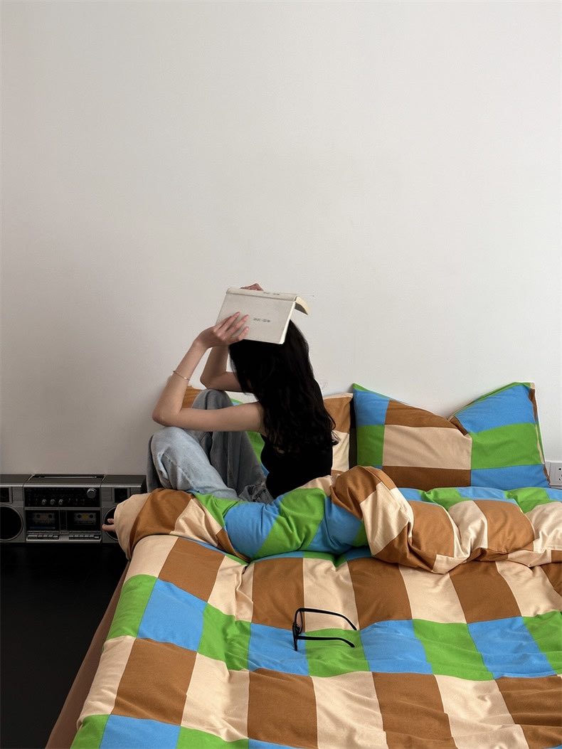 Come with 1 duvet cover, 2 pillowcases & 1 complimentary matching fitted sheet, this dopamine checker bedding set is crafted for both comfort and style. Featuring classic checker designs with a dopamine twist, this luxurious bedding set would add a playful touch to your bedroom, bringing along with warmth, comfort and style. Purely constructed with organic cotton, it would wrap you in cozy comfort like a warm gentle hug and offer a soft luxurious feel for a restful sleep.