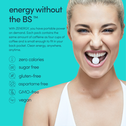 With ZENERGY, you have portable power on demand. Each pack contains the same amount of caffeine as four cups of coffee and is small enough to fit in your back pocket. Clean energy, anywhere, anytime