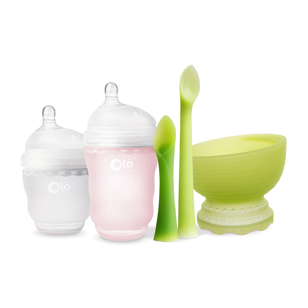 The Olababy feeding gift set provides the best feeding essentials from bottle feeding to the introduction of solids thru baby-led weaning. It includes a 4oz GentleBottle with slow-flow nipple, an 8oz GentleBottle with medium-flow nipple, a soft-tip parent feeding spoon, a baby-led weaning training spoon and a SteamBowl. All of these essential baby feeding products are designed to engage baby with enticing colors, easy-grip, and naturally inspired shapes. All products are made with 100% toxin free silicone that is BPA and phthalates free.