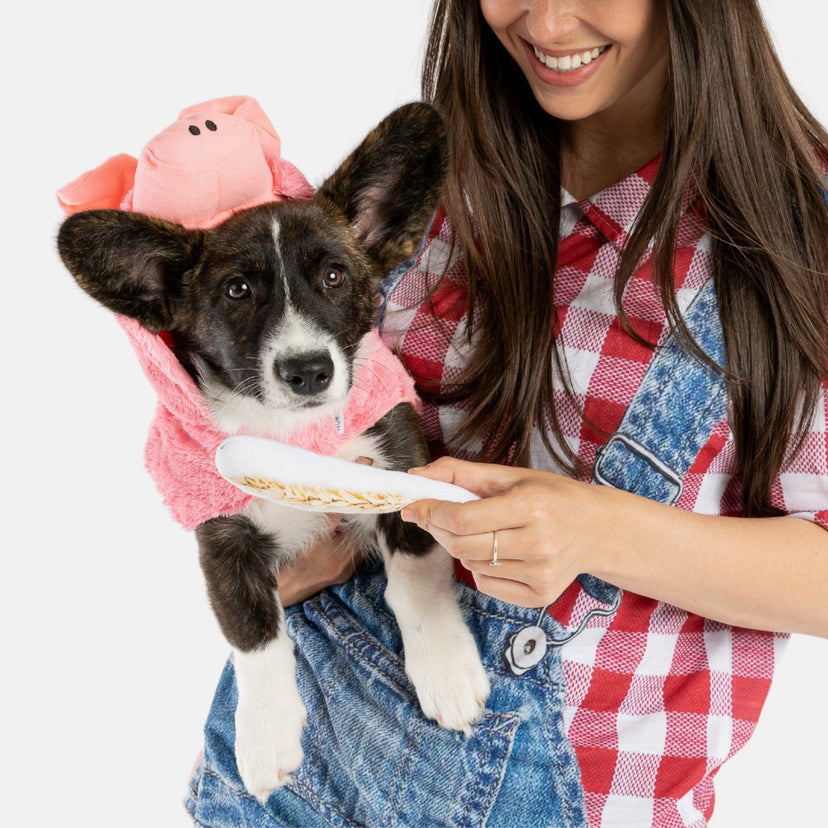 Every farmer has barnyard animals, and we are no exception. Match your pups Pig or Cow costume with our hooman version. This costume comes with a sublimation print t-shirt, straw hat and stuffed wheat. All that’s missing is your animal friends!
