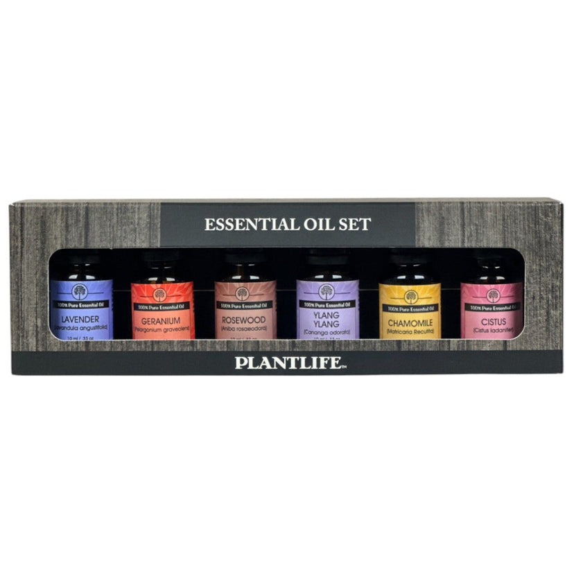 Set Includes 1-10ml bottle each of: Lavender, Geranium, Rosewood, Ylang Ylang, Chamomile and Cistus