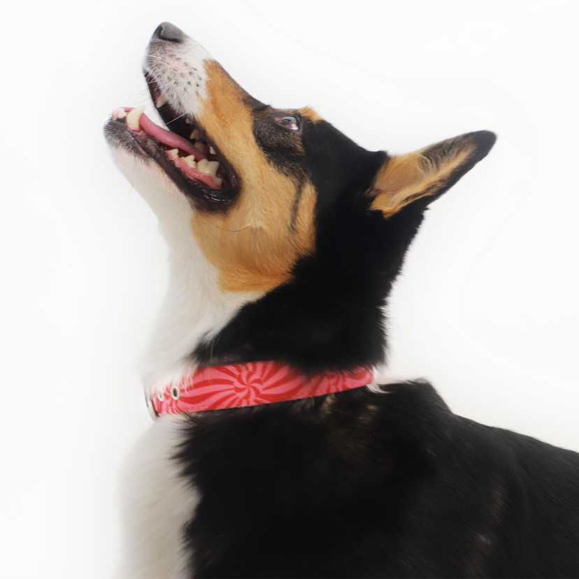 A candy stripe collar with pink and red swirls. Made with rust-resistant metal hardware and ultra durable, rip-resistant material and stitching for strong and long wear.