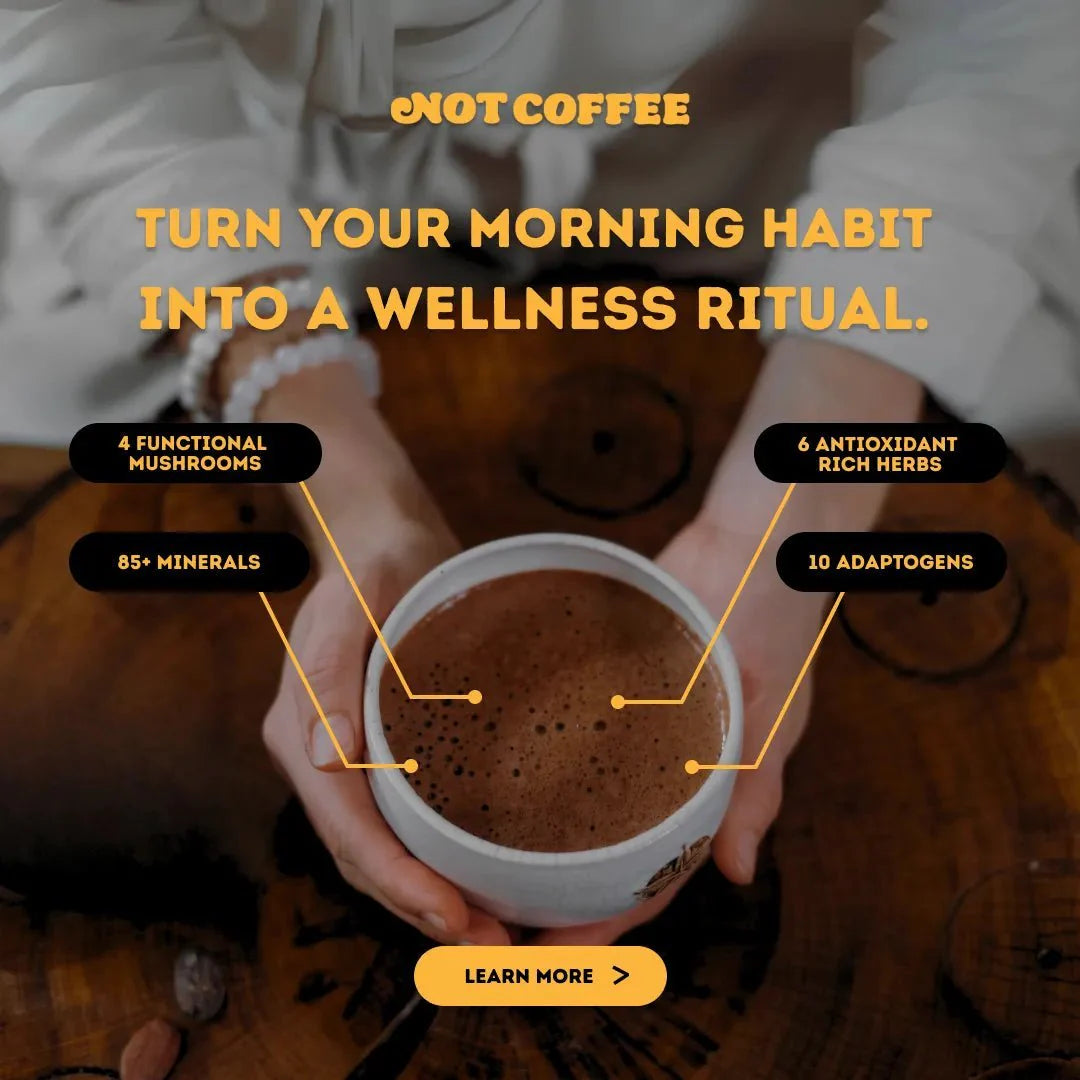 The award-winning coffee replacement, NOT COFFEE is a powerhouse of sustainable energy, focus, and immunity, without the jitters and caffeine crash you expect from coffee.