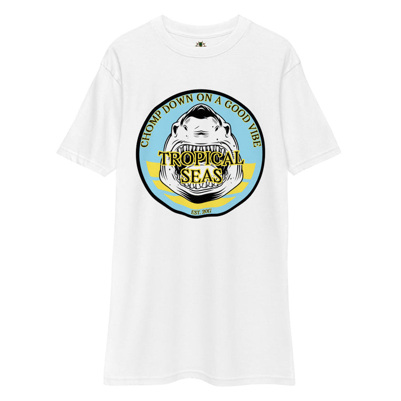 Elevate your summer style with the men's Good Vibe Chomp tropical t-shirt. This premium tee features a classic, sophisticated fit made with durable ring-spun cotton material that is both soft and comfortable. The tropical print design adds a touch of island vibes to your wardrobe. Whether layered or worn on its own, the men's Hawaiian shirt is the perfect choice for effortless summer style. Upgrade your wardrobe today with this must-have men's tropical print t-shirt!