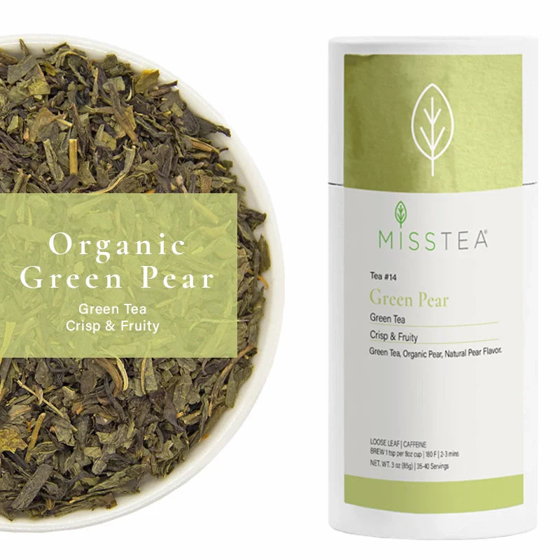 Ingredients: Organic Sencha Green Tea, Organic Himalaya Green Tea, Organic Pear Pieces, Pear Flavor.