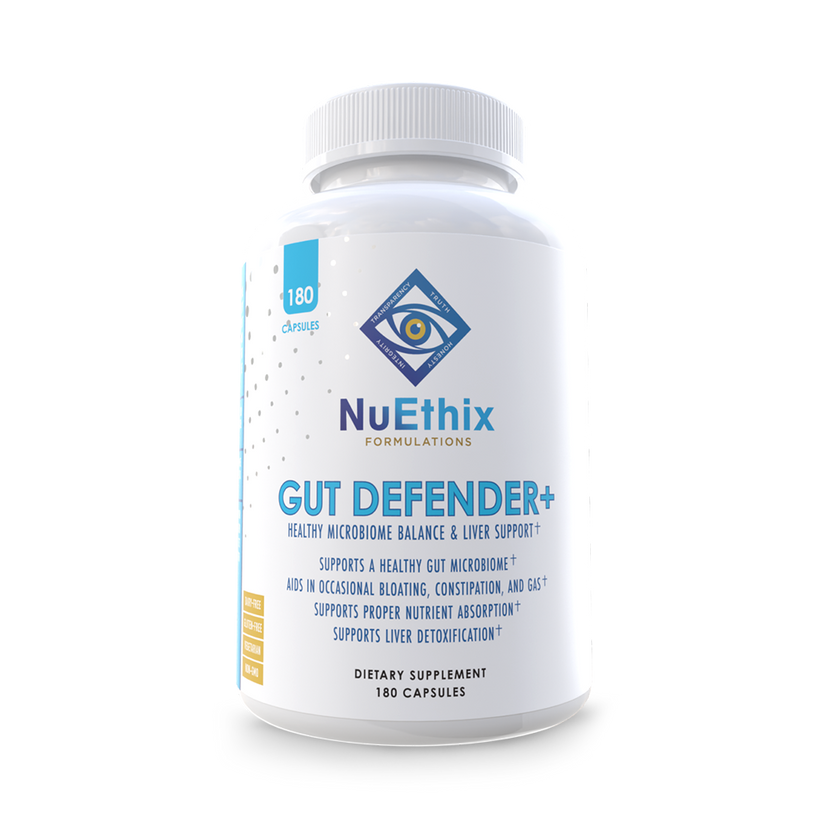 Gut Defender+ is a unique blend of herbs, vitamins, and minerals aimed at balancing a healthy microbiome in the intestinal tract to support improved digestive health, immune function, and mood.