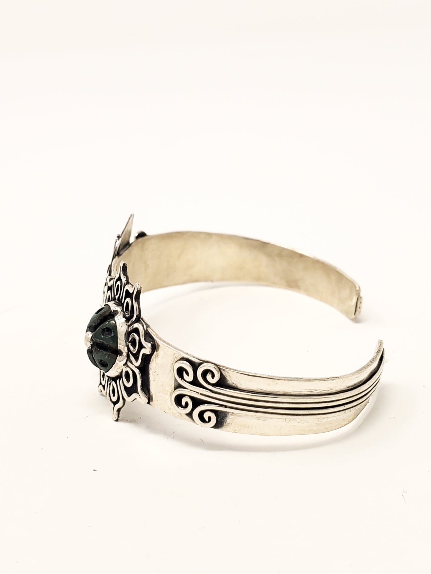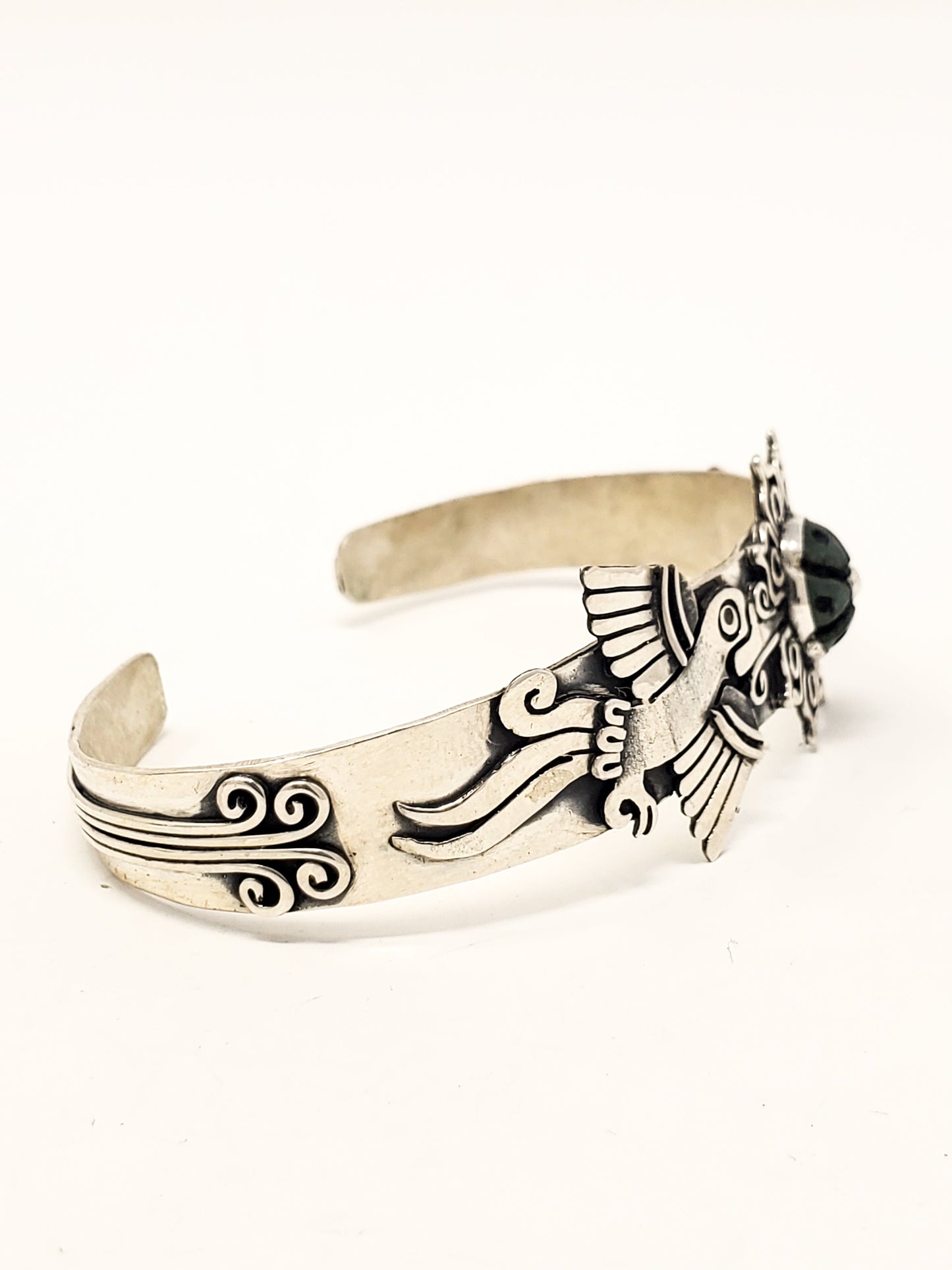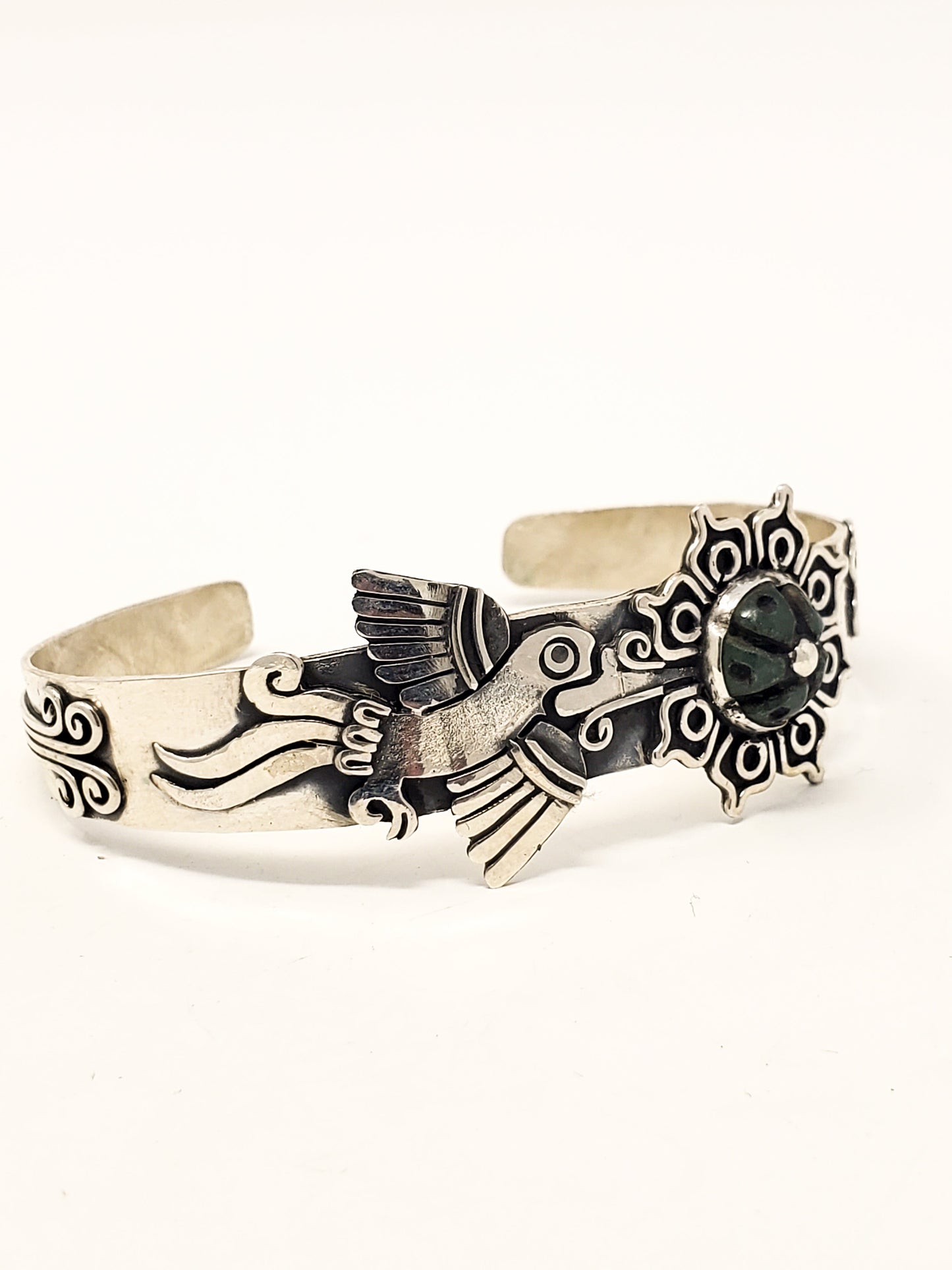 Introducing a unique piece of jewelry, handcrafted from 925 sterling silver. This bracelet features a beautifully carved hummingbird and a peyote, both symbolizing important spiritual themes in Aztec culture. The hummingbird, a symbol of happiness and joy, is often associated with love, good fortune, and the ability to bring light into dark situations. In Aztec mythology, hummingbirds were believed to have the power to lift the hearts of those around them and to inspire positivity and peace.