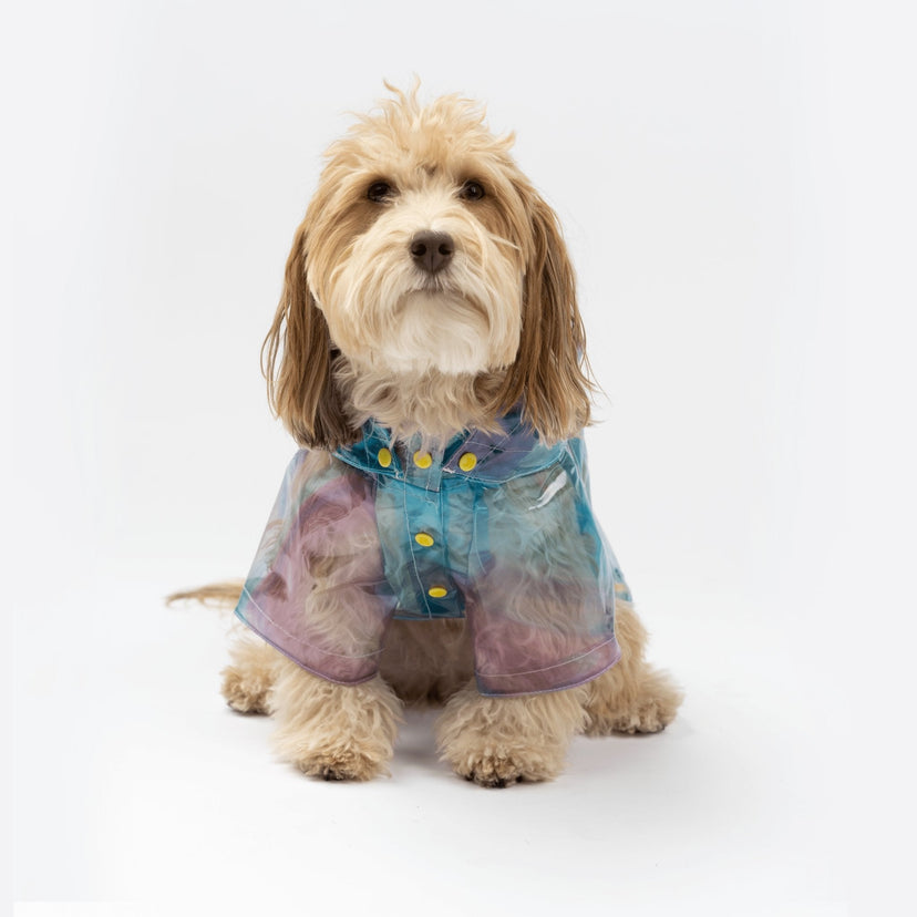Do you ever look at a puddle and see a range of beautiful colors? Well, we took a puddle and put it on a raincoat just for you! The Kinney dog rain jacket is made up of a psychedelic transparent see-through design that is waterproof too…duh! We added a buttonhole for easy leash access, a removable hood and bright branded snaps to complete the design.