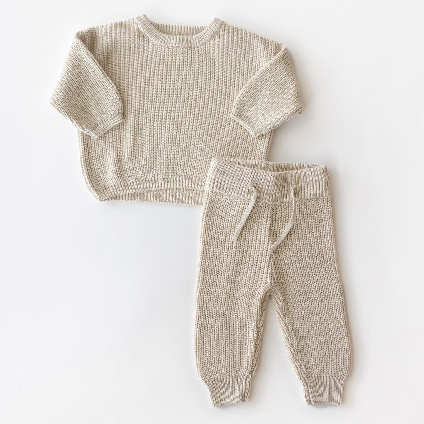 Keep your little one snug and stylish in our Knit Jogger Set, made from 100% soft, breathable cotton. This cozy set features a relaxed-fit knit top and matching jogger pants, designed for ultimate comfort and flexibility. The classic oatmeal color adds a timeless, neutral touch that’s perfect for layering during the cooler months. With an easy-on, stretchy waistband with drawstring and cuffed ankles, the joggers stay in place during playtime and naps alike. Ideal for everyday adventures or lounging at home, this versatile set is a must-have for your little one’s wardrobe.