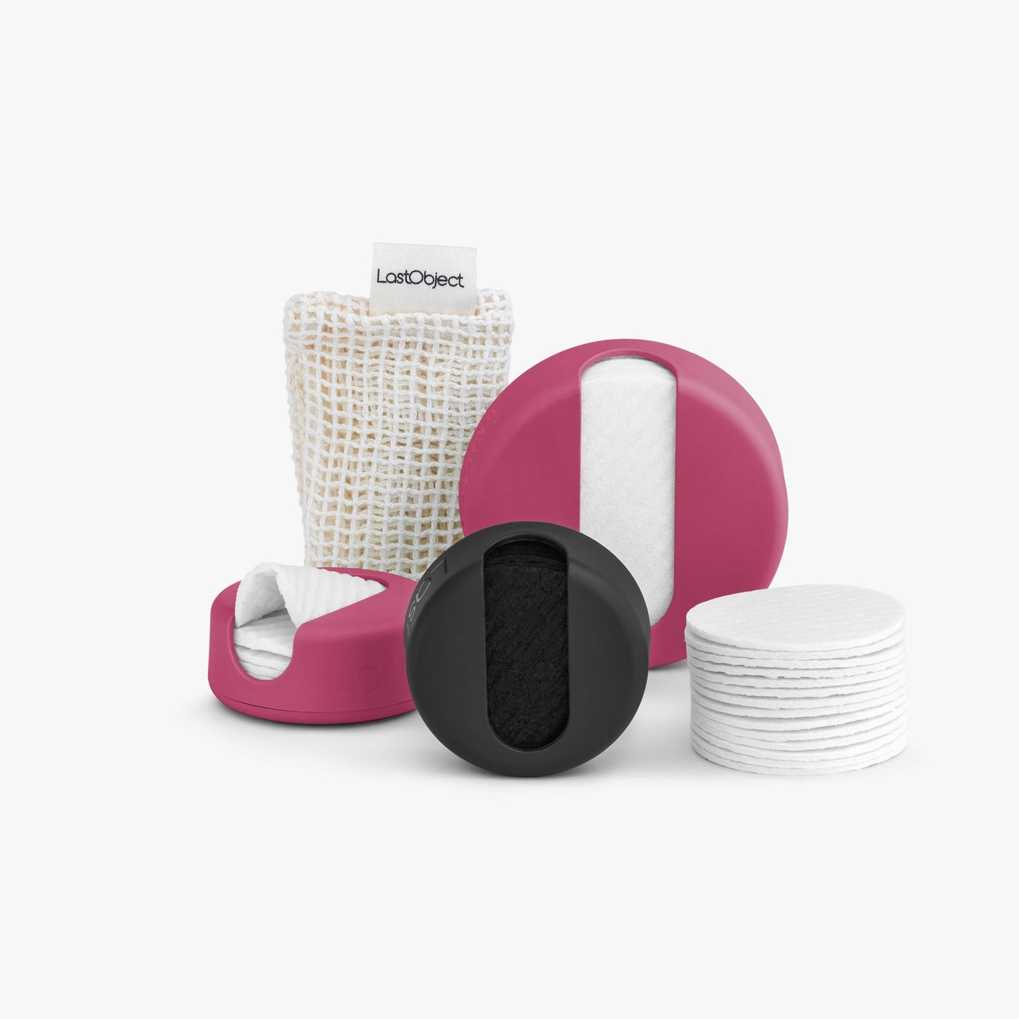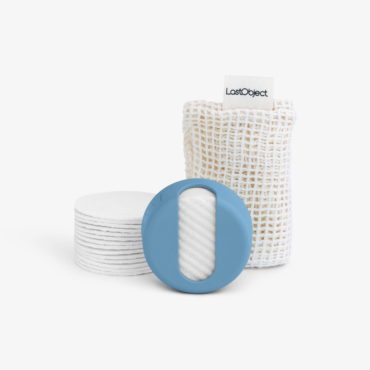 Reusable rounds made of a shape-shifting fabric that feels just like regular cotton rounds when wet. Contains 1x Case Made From Ocean Bound Plastic, 21x Reusable Rounds and a organic cotton washing bag.