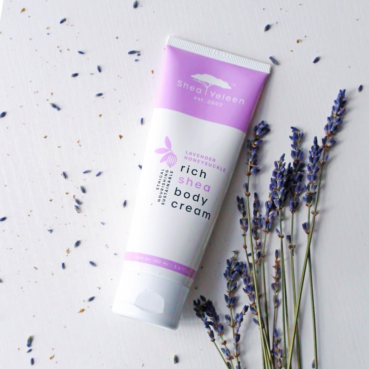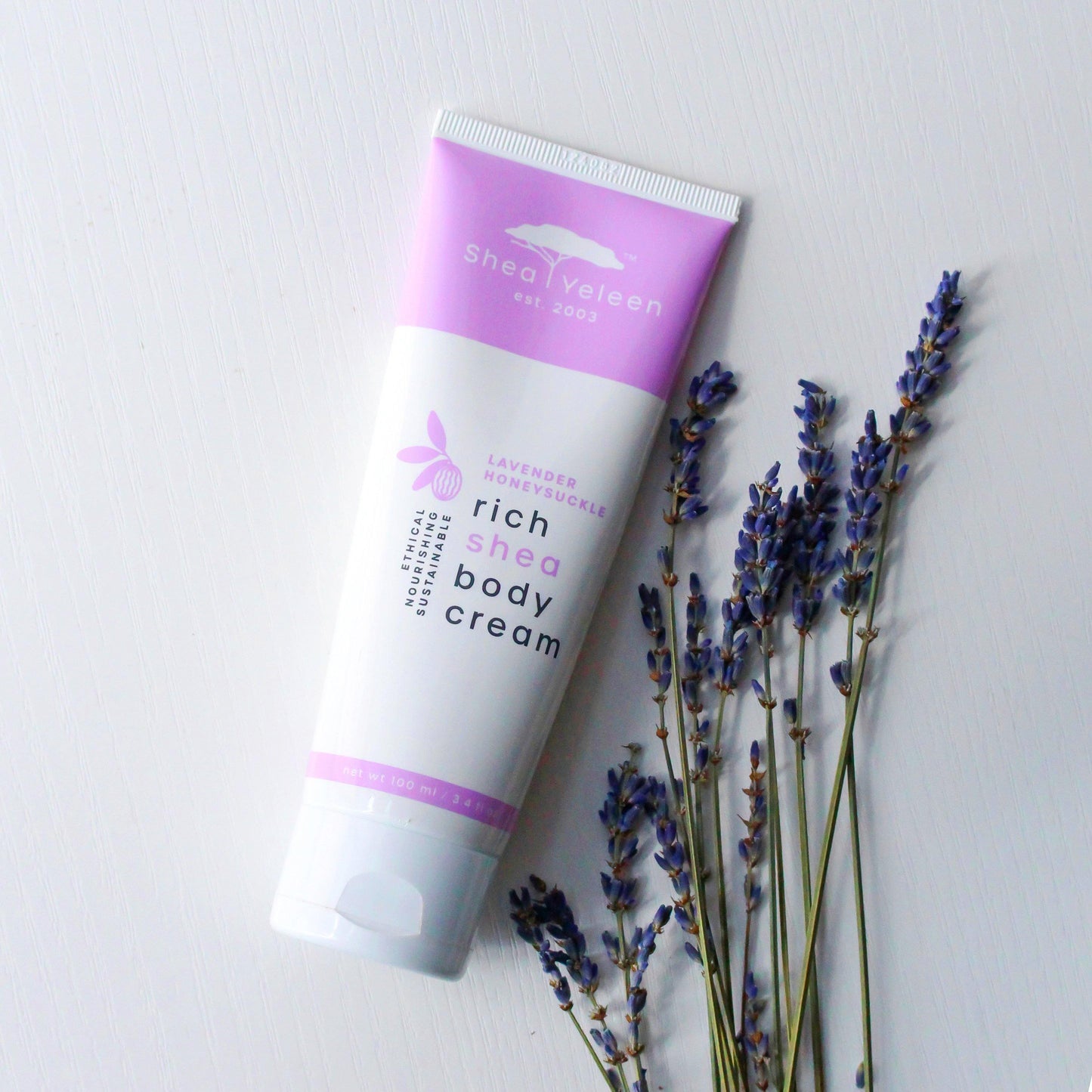 Shea Yeleen Lavender Honeysuckle Shea Butter Body Cream is packed with natural, unrefined shea butter. It contains our ultra-hydrating formula which is rich in vitamins and will instantly smooth your skin, leaving it glowing. This smaller size is great for the purse or bag during travel and commutes.